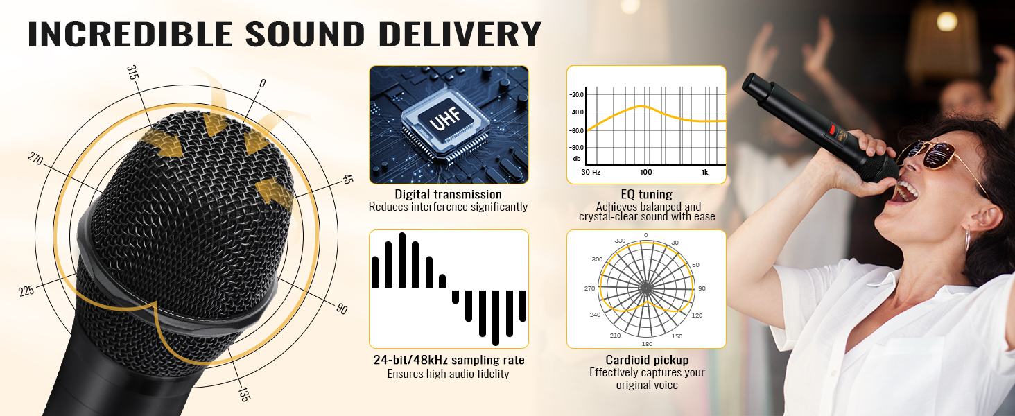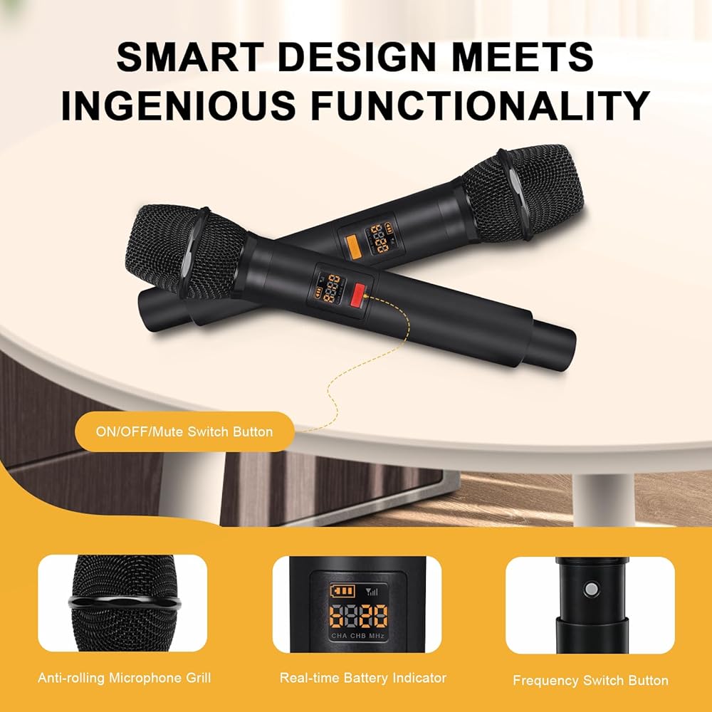 صوت نقي نقي: يتميز نظام الميكروفون اللاسلكي هذا بنقل رقمي UHF، ويتميز بمعدل أخذ عينات 24 بت/48 كيلو هرتز يعزز ديناميكيات الصوت ودقته. يعمل ضبط EQ الخاص على إثراء النهايات المنخفضة ونغمات التردد العالي لضمان جودة صوت متوازنة وواضحة تمامًا. يعمل نمط الالتقاط القلبي لميكروفون الكاريوكي على عزل الضوضاء البيئية، مما يعيد إنتاج الصوت الأصلي بدقة وفعالية