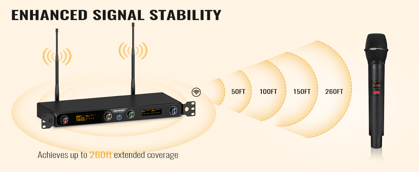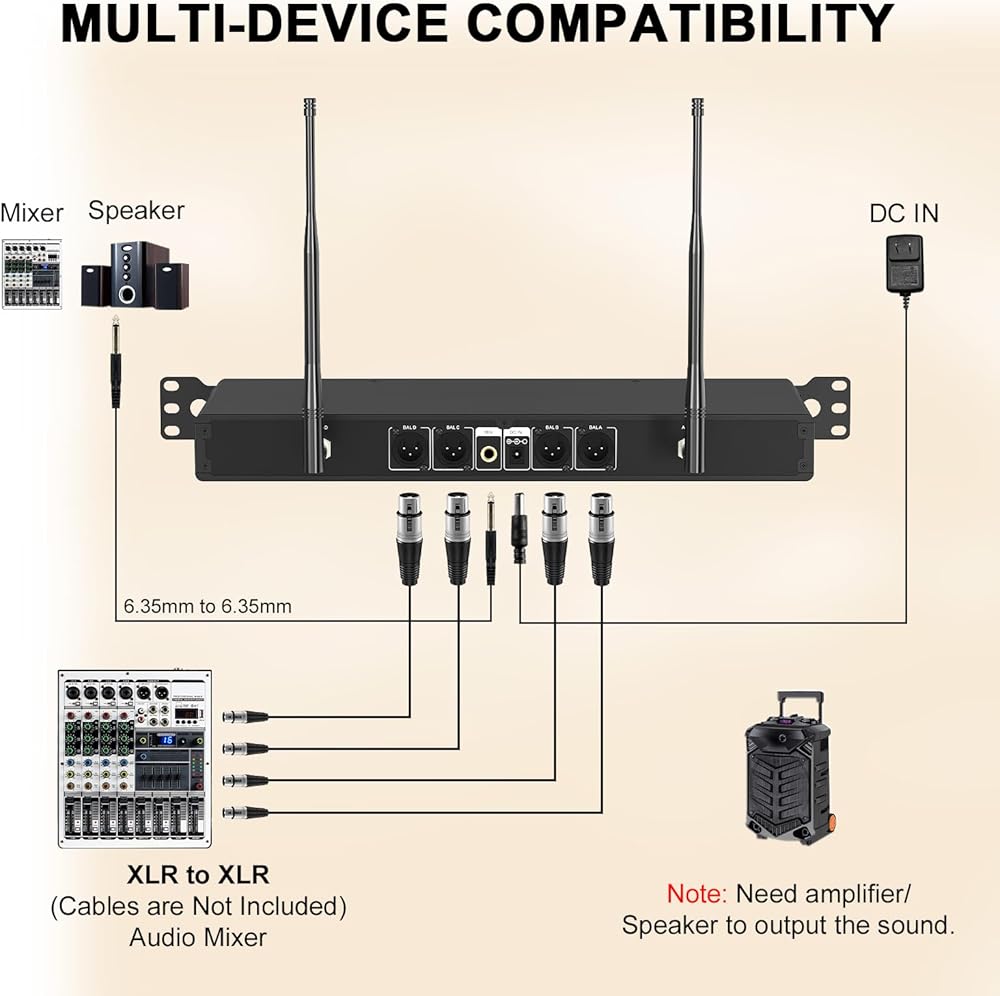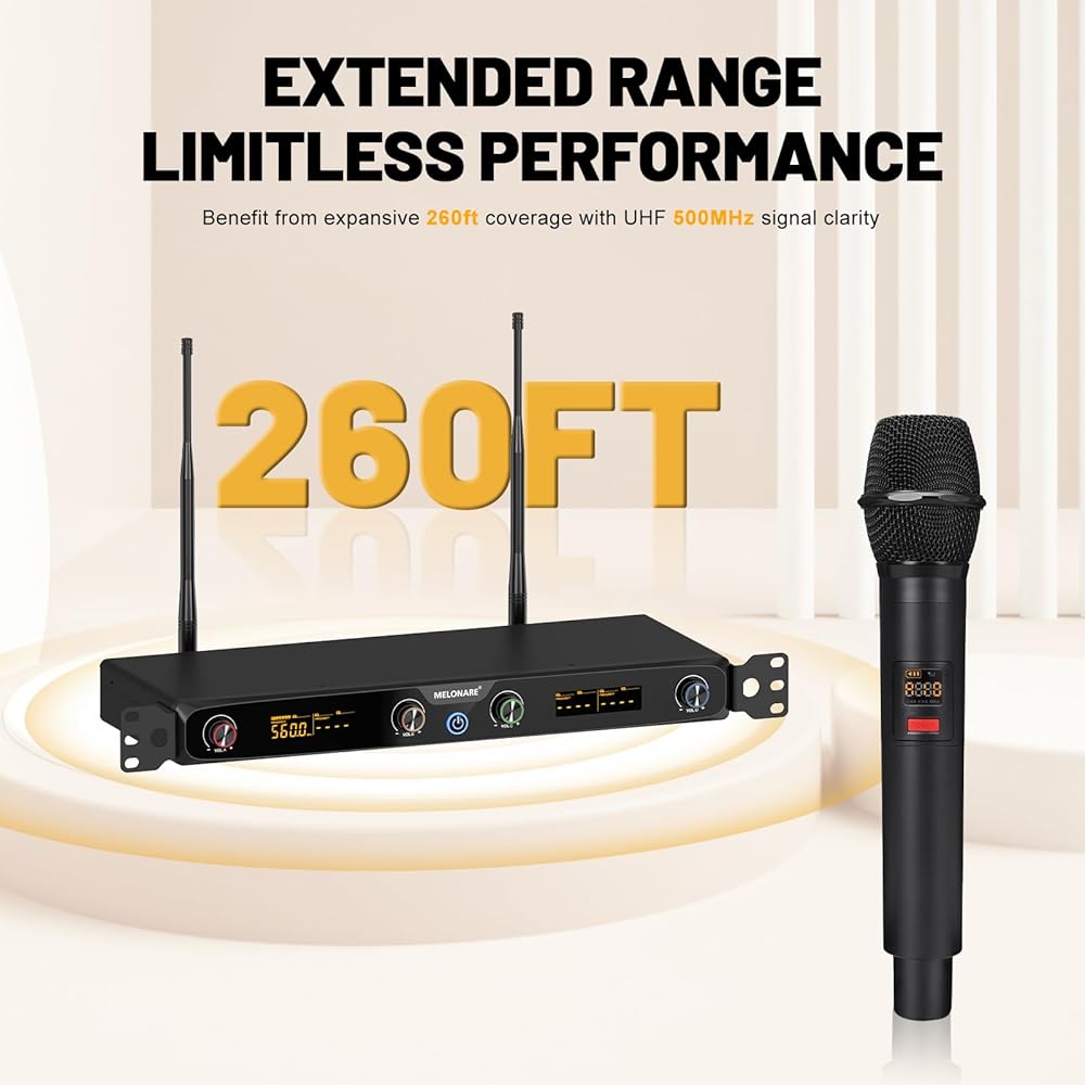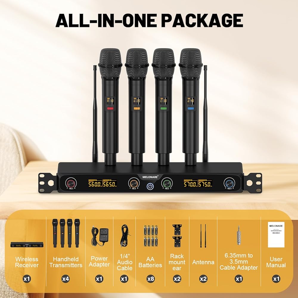 راحة تركيب RACKMOUNT: تأتي مجموعة الميكروفون اللاسلكية هذه مع آذان رف، مما يسمح لك بتركيب جهاز الاستقبال على الرف ودمجه بسلاسة مع المعدات الصوتية الأخرى. يعمل هذا الإعداد الاحترافي على تحسين توصيل الصوت في أي مكان - وهو مثالي للكاريوكي المنزلي والحفلات وأحداث الدي جي وحفلات الزفاف والكنائس