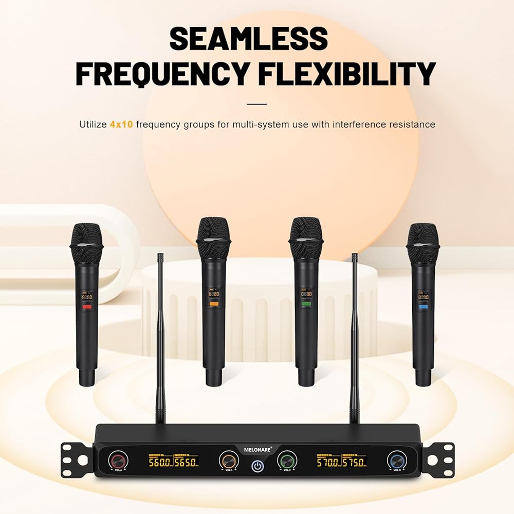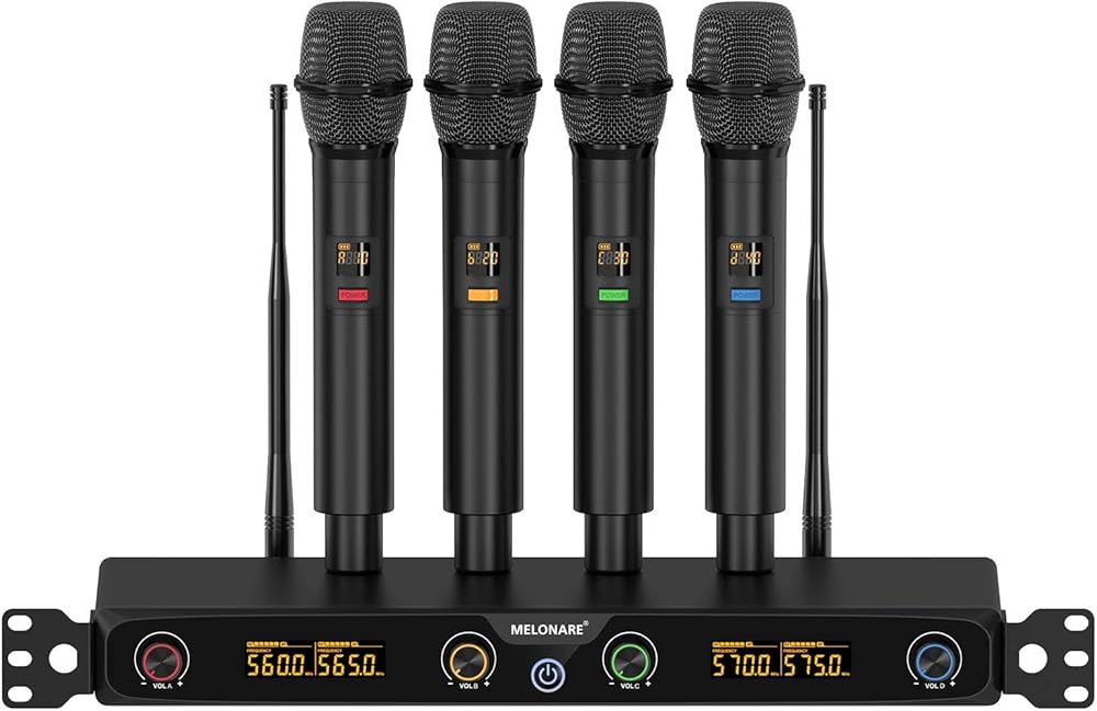 نظام ميكروفون لاسلكي ذو 4 قنوات، مجموعة ميكروفون لاسلكي قابل للتركيب على حامل UHF مع ترددات 4 × 10، نطاق 260 قدم، ميكروفون ديناميكي محمول للغناء والكاريوكي والكنيسة ودي جي والحفلات (MWM-41F)
