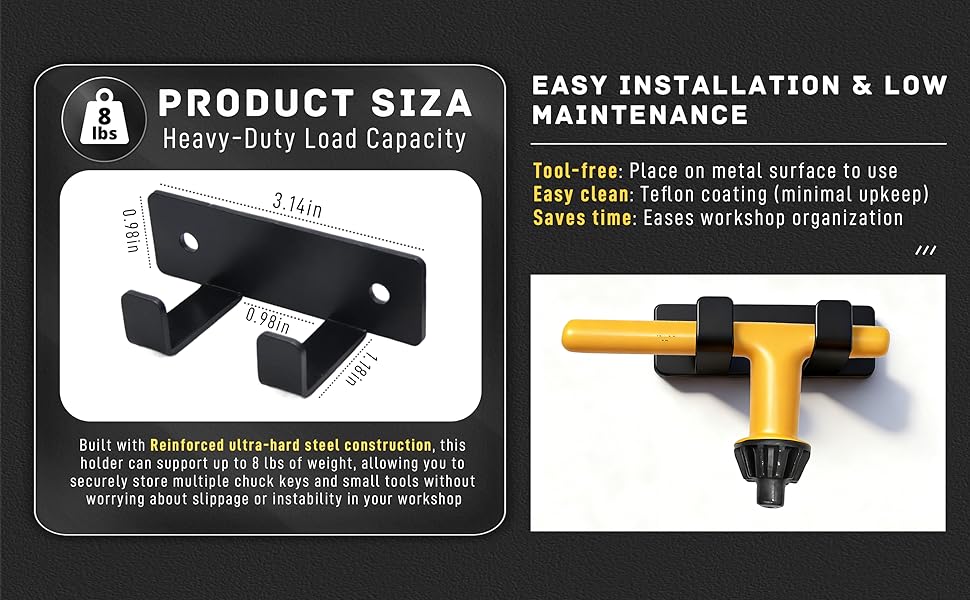 سعة تحميل عالية التحمل: مصنوع من الفولاذ المقوى فائق الصلابة، يمكن لهذا الحامل أن يدعم ما يصل إلى 8 أرطال من الوزن، مما يسمح لك بتخزين العديد من مفاتيح تشاك والأدوات الصغيرة بشكل آمن دون القلق بشأن الانزلاق أو عدم الاستقرار في ورشة العمل الخاصة بك