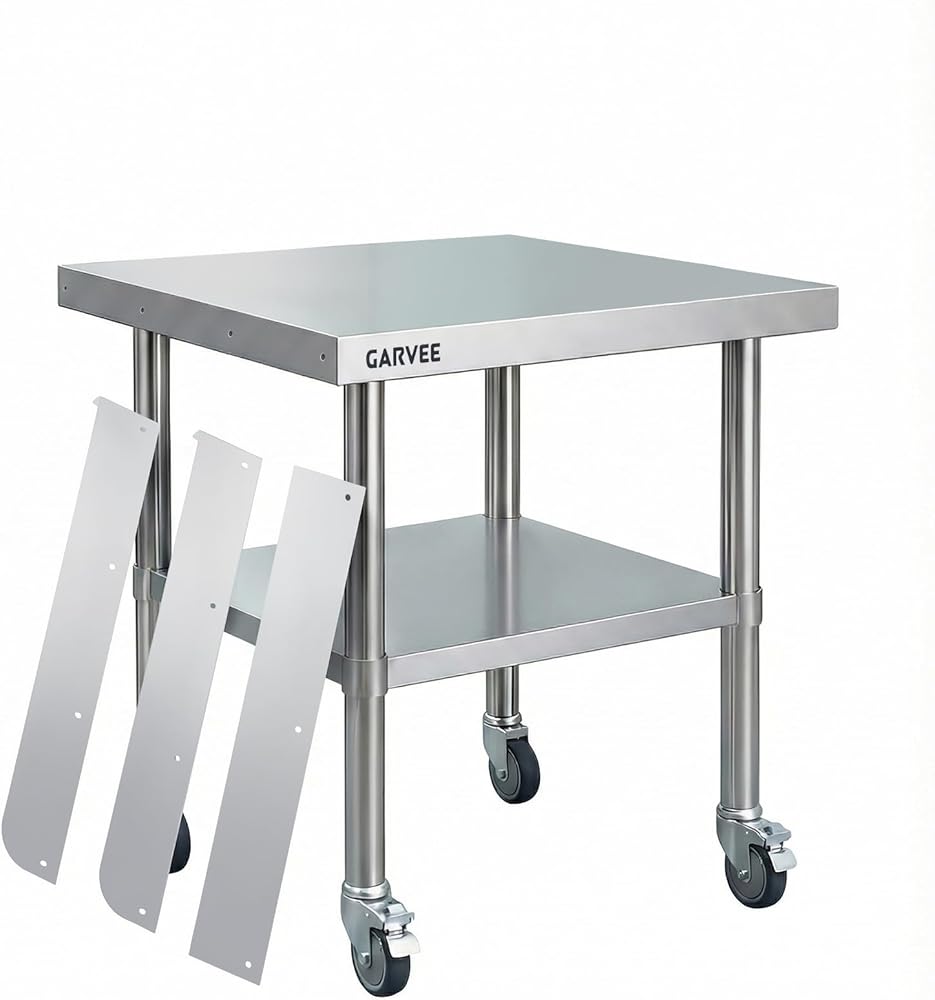 طاولة عمل من الفولاذ المقاوم للصدأ شديدة التحمل مقاس 24 × 24 بوصة مع سبلاش خلفي قابل للفصل من 3 جوانب، رف سفلي قابل للتعديل، عجلات قفل، طاولة إعداد تجارية للمطعم، المطبخ، المرآب