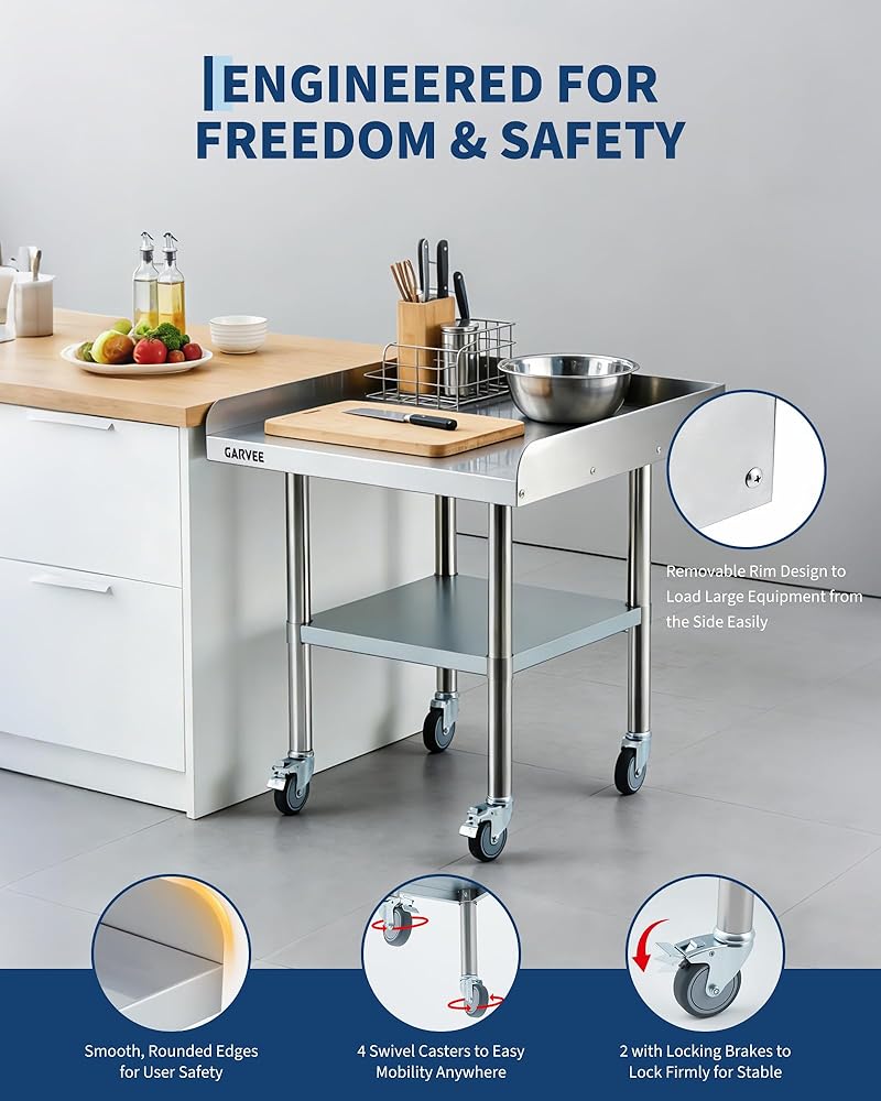 Detachable 3-Sided Backsplash: The removable backsplash protects against spills and keeps ingredients, tools, and equipment safely contained, making cleanup quick and simple.