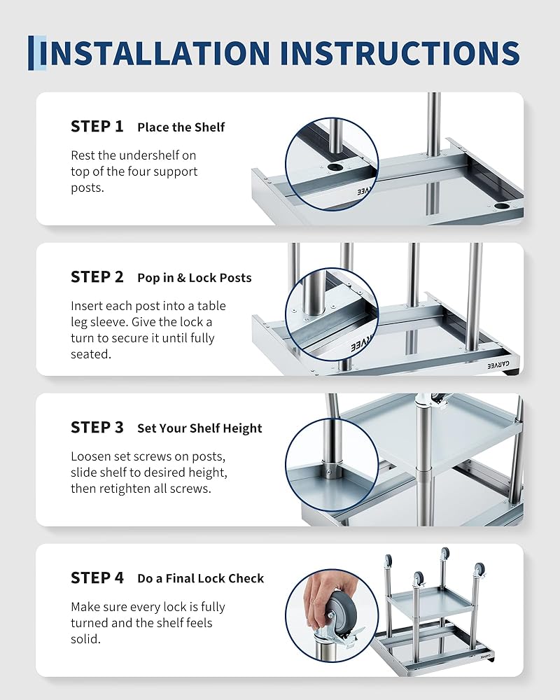 Adjustable Undershelf: Customize your storage space for utensils, equipment, or supplies with the height-adjustable undershelf, helping you stay organized and efficient during busy shifts.