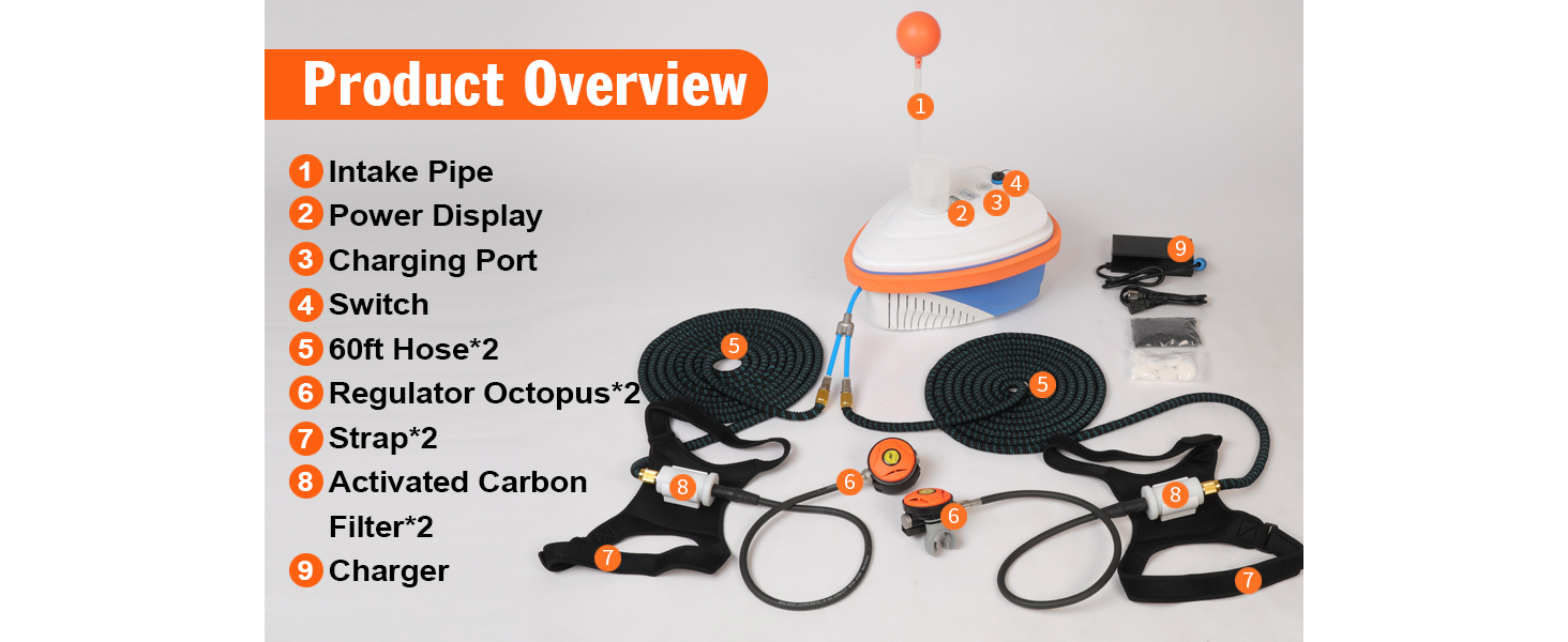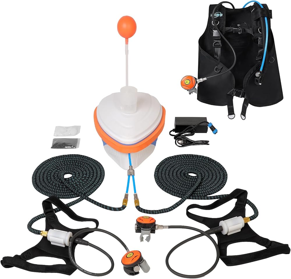 نظام غوص بالهواء المضغوط المحسن: مدعوم بمحرك مضخة هواء عالي الكفاءة، يوفر نظام الغطس المطور هذا تدفقًا مستمرًا للهواء من السطح من خلال ضاغط قوي وخرطوم. استمتع بالتنفس تحت الماء بسهولة واترك خزانات الأكسجين الضخمة خلفك لتتمتع بغوص أخف وأكثر حرية