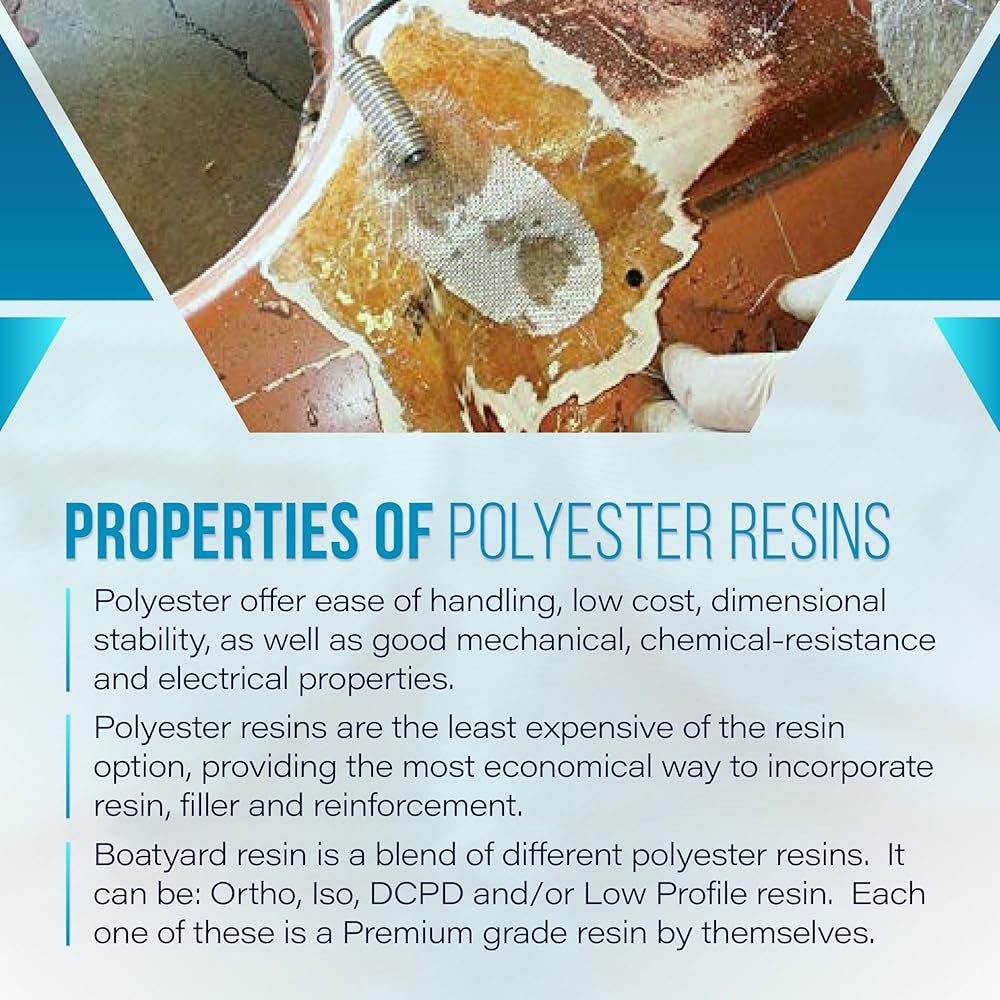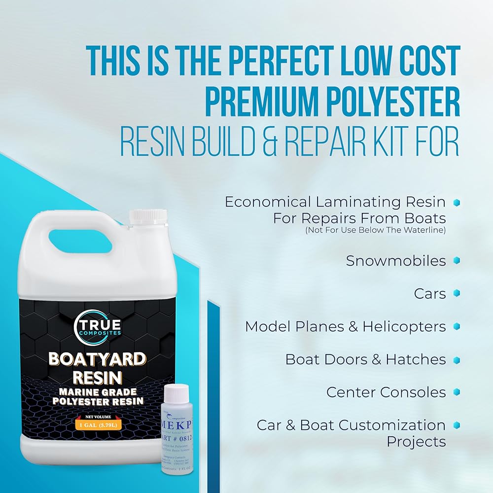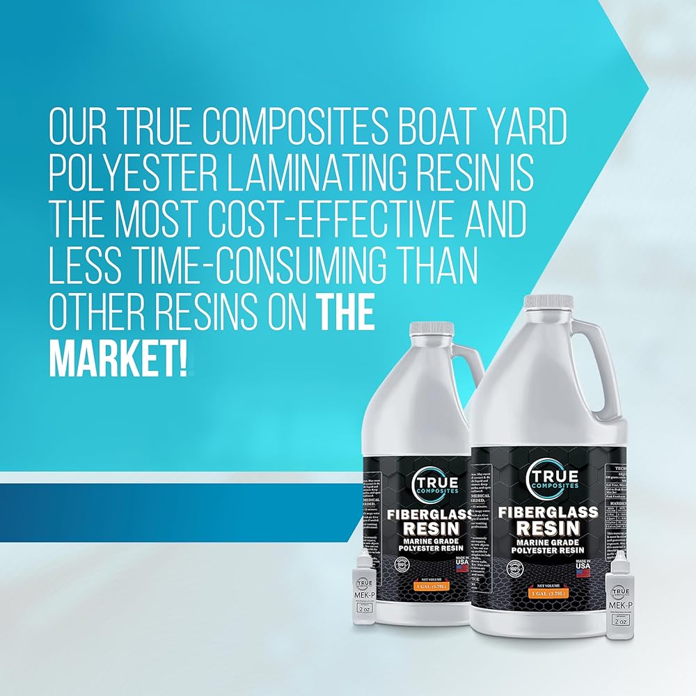 Welcome to TRUE COMPOSITES Boatyard Polyester Resin, your ultimate DIY companion for all your repair and small-scale production needs! Our Boatyard Polyester Resin may contain a mix of ortho- and/or iso-, and DCPD low-profile resins, offering exceptional flexibility for your DIY projects. Because of the resin is a DCPD blend, it will cure hard and tack-free. If it does, remember to sand the surface before applying additional layers—this ensures optimal bonding and seamless integration. With a recommended application temperature of 77°F, you can achieve the best results between 65°F and 85°F. Just make sure your workspace is clean, dry, and dust-free! Perfect for DIY projects, our resin works well with various materials, including fiberglass cloth, making it a reliable choice for fiberglass repair, resin molds, and more. Whether you're repairing a fiberglass tub, boat, car or creating a mold, the Boatyard Polyester Resin is your go-to product. Targeted at the DIY community, our Boatyard Polyester Resin is not just limited to marine applications. Its versatility extends to automotive repairs, wood repair kits, and even creative resin projects with resin molds. Dive into your next DIY adventure with TRUE COMPOSITES, knowing you have a product that stands up to the challenge. Whether it's a fiberglass shower repair kit or a resin and hardener project, your satisfaction is our priority. Embrace the power of Boatyard Polyester Resin and transform your DIY dreams into reality!