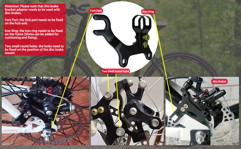 【Specifications】Material: Metal. For MTB Type: Universal. Type: Disc Brake Bracket Frame Adaptor. Position: Rear Tires(Generally). Removable: Feel free to get creative with your bike brakes! Attention: Please note that this brake bracket adapter needs to be used with disc brakes and is only compatible with disc brake pad.