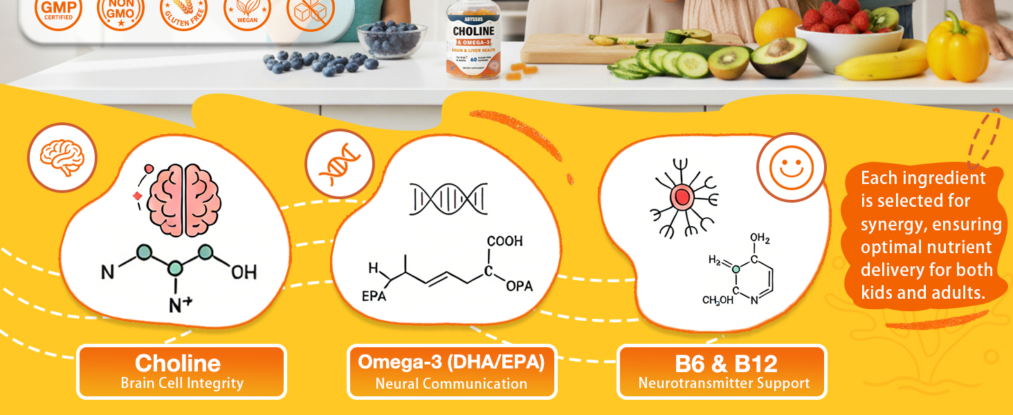 تركيبة يومية لطيفة للمراهقين والبالغين والأطفال في مرحلة النمو: تم تناول جرعات بعناية لكل من الأطفال (من سن 4 سنوات فما فوق) والبالغين، وقد تم تصميم مكمل الكولين هذا للاستخدام اليومي من قبل الطلاب والمهنيين المشغولين والآباء وكبار السن الذين يبحثون عن دعم أساسي للدماغ والجهاز العصبي والصحة العامة.