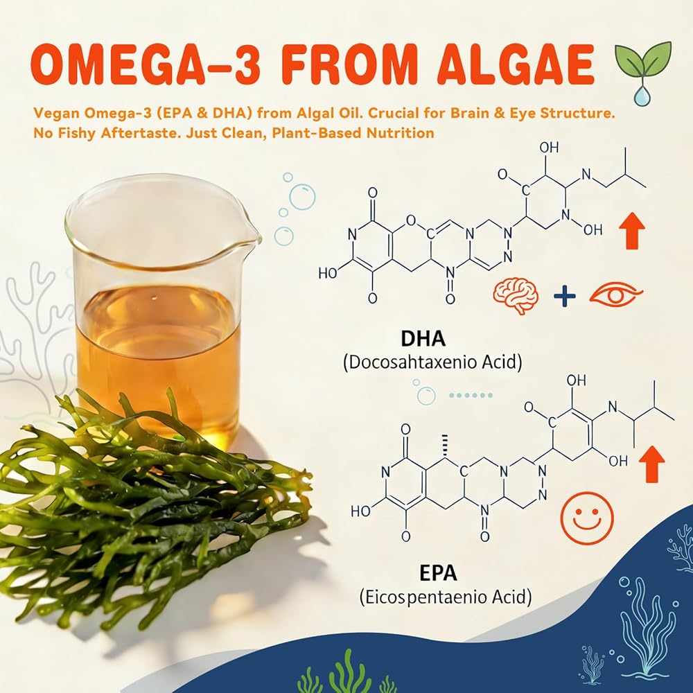 أوميغا 3 من الطحالب - بدون مذاق: يوفر زيت الطحالب النظيف والمستدام الخاص بنا 60 ملغ من DHA و40 ملغ من EPA لكل وجبة للبالغين - وهي أحماض دهنية أساسية تتركز بشكل طبيعي في الدماغ والعينين. يدعم الصحة البصرية بدون مكونات مشتقة من الأسماك