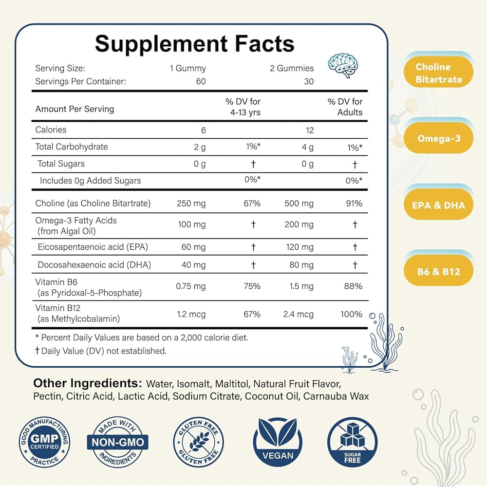 مكملات الكولين مع أوميغا 3 DHA: تم تركيبه باستخدام 500 مجم من بيتارترات الكولين (جرعة للبالغين) و60 مجم من DHA من مصادر الطحالب لكل وجبة - يدعم وظيفة الدماغ الصحية وصحة الكبد. الكولين هو عنصر غذائي أساسي يشارك في إنتاج الناقلات العصبية ونقل الدهون من الكبد، مما يساعد في الحفاظ على الطاقة.
