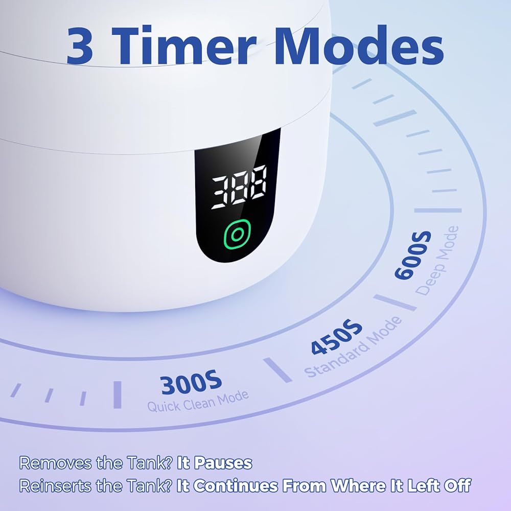Touch Control for Easy Pause and Resume: Simply touch the display screen to turn the cleaner on/off, with a digital display showing the remaining cleaning time. Choose between 300s, 450s, or 600s cycles to suit your needs. Lift the inner tank to pause the cleaning and resume when put it back.