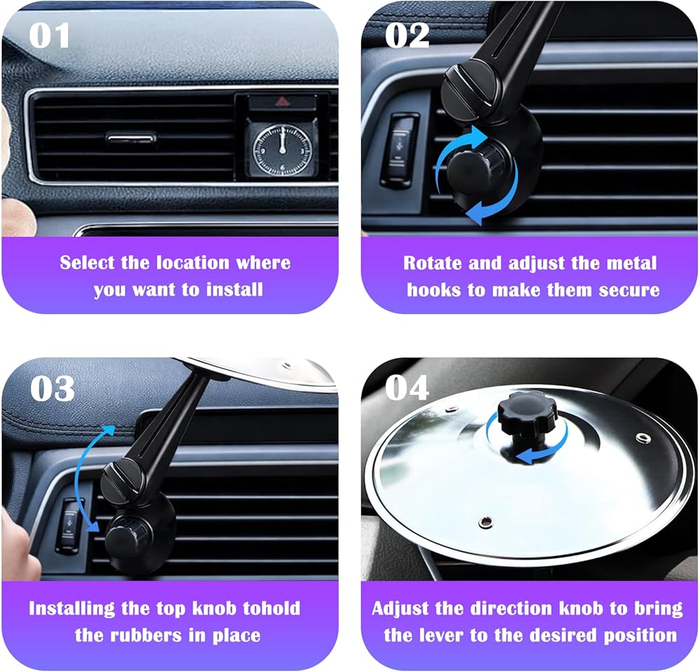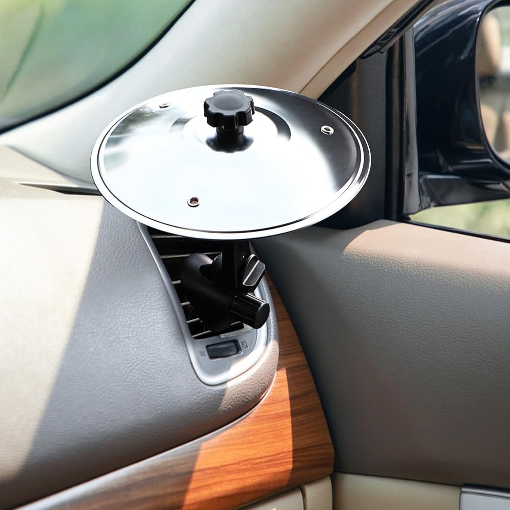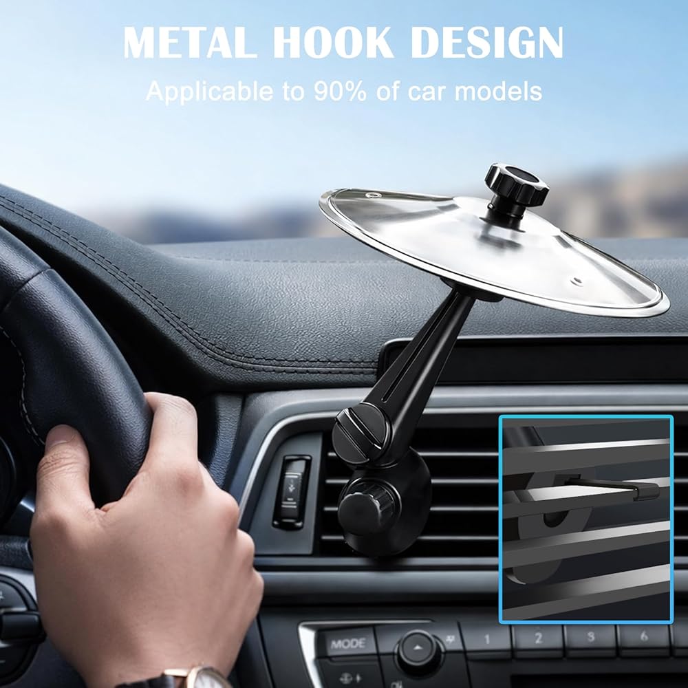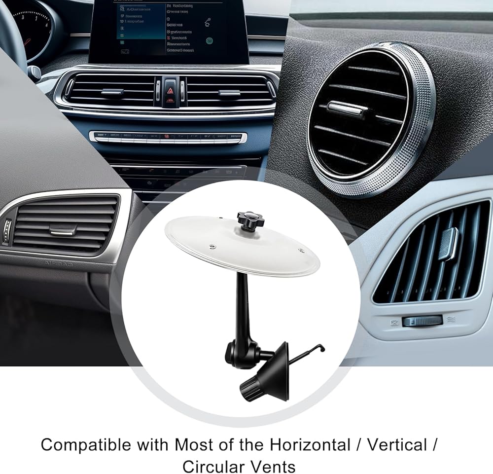 Transform your vehicle's interior with this innovative air vent phone mount that brings both style and functionality to your dashboard. Featuring a unique cymbal-inspired design in sleek silver and black, this universal mount securely holds your device while adding a distinctive aesthetic touch. The adjustable metal arms provide versatile positioning and firm grip, accommodating phones of various sizes. Installation is straightforward - simply attach to your car's air vent for instant use. The premium metal construction ensures durability and stability while driving, while the thoughtful design allows for unobstructed airflow. Perfect for navigation, hands-free calls, or media control, this mount combines practical utility with eye-catching design elements that will appeal to music enthusiasts and drivers alike. The rotating mechanism allows for optimal viewing angles, whether you prefer portrait or landscape orientation. Note that this mount is designed to work with most standard vehicle air vents and modern smartphones.