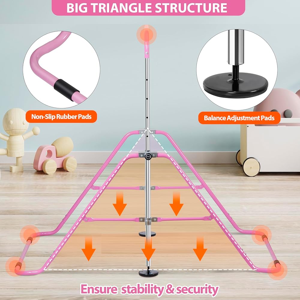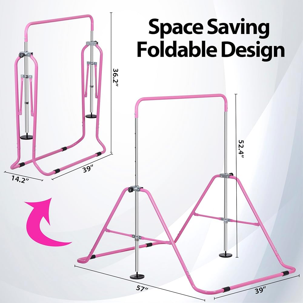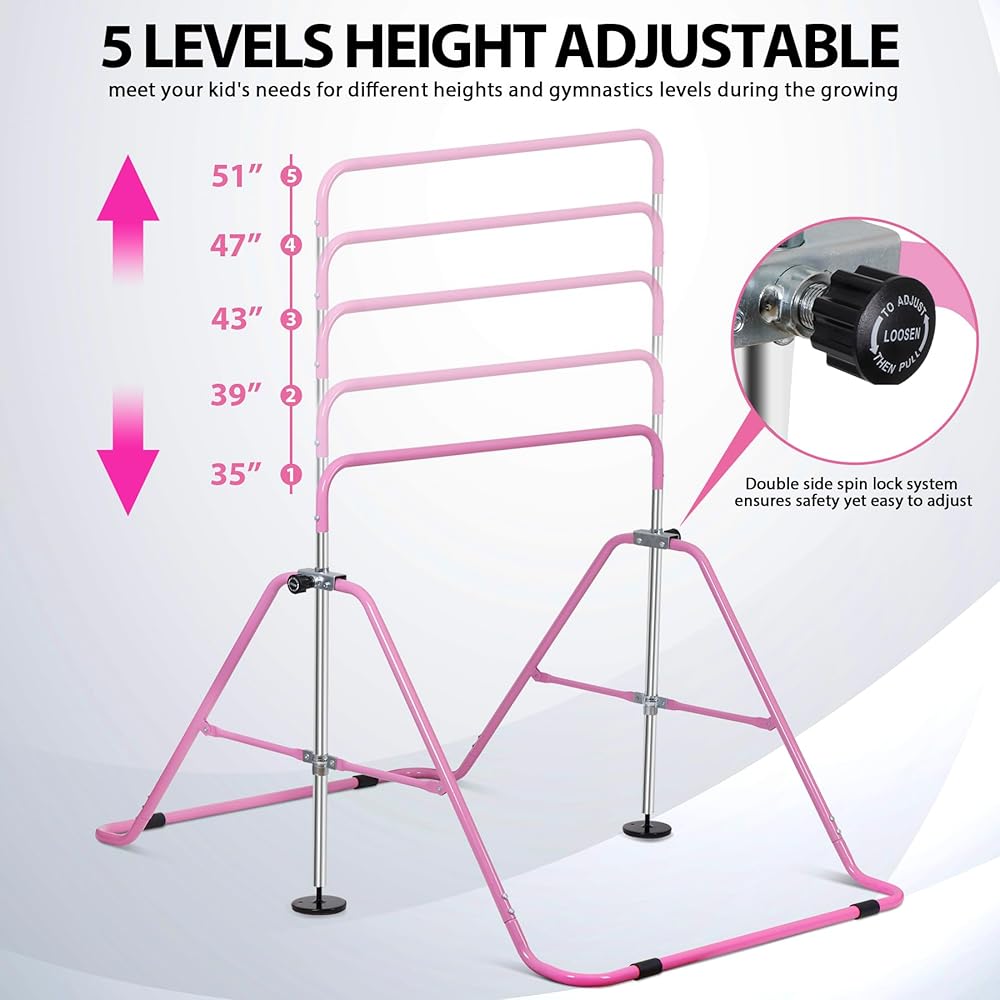 4 ارتفاعات قابلة للتعديل: قضيب الجمباز القابل للطي مصنوع من أنابيب فولاذية بسمك 2 مم، وهو مثالي للاعبي الجمباز الصغار حيث يمكن تعديله ليناسب طولهم مع نموهم، مع 5 ارتفاعات قابلة للتعديل (36.2 بوصة، 41.3 بوصة، 46.5 بوصة، 52.4 بوصة)، أقصى سعة للوزن تصل إلى 120 رطلاً