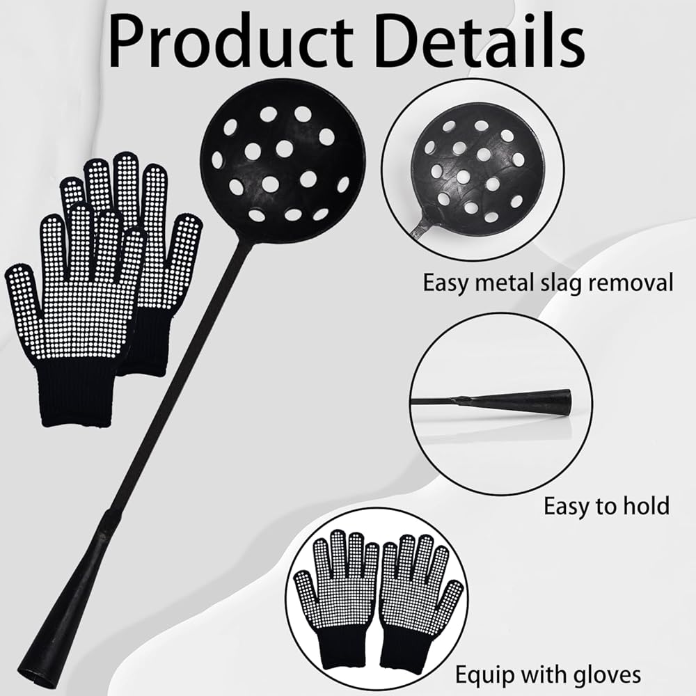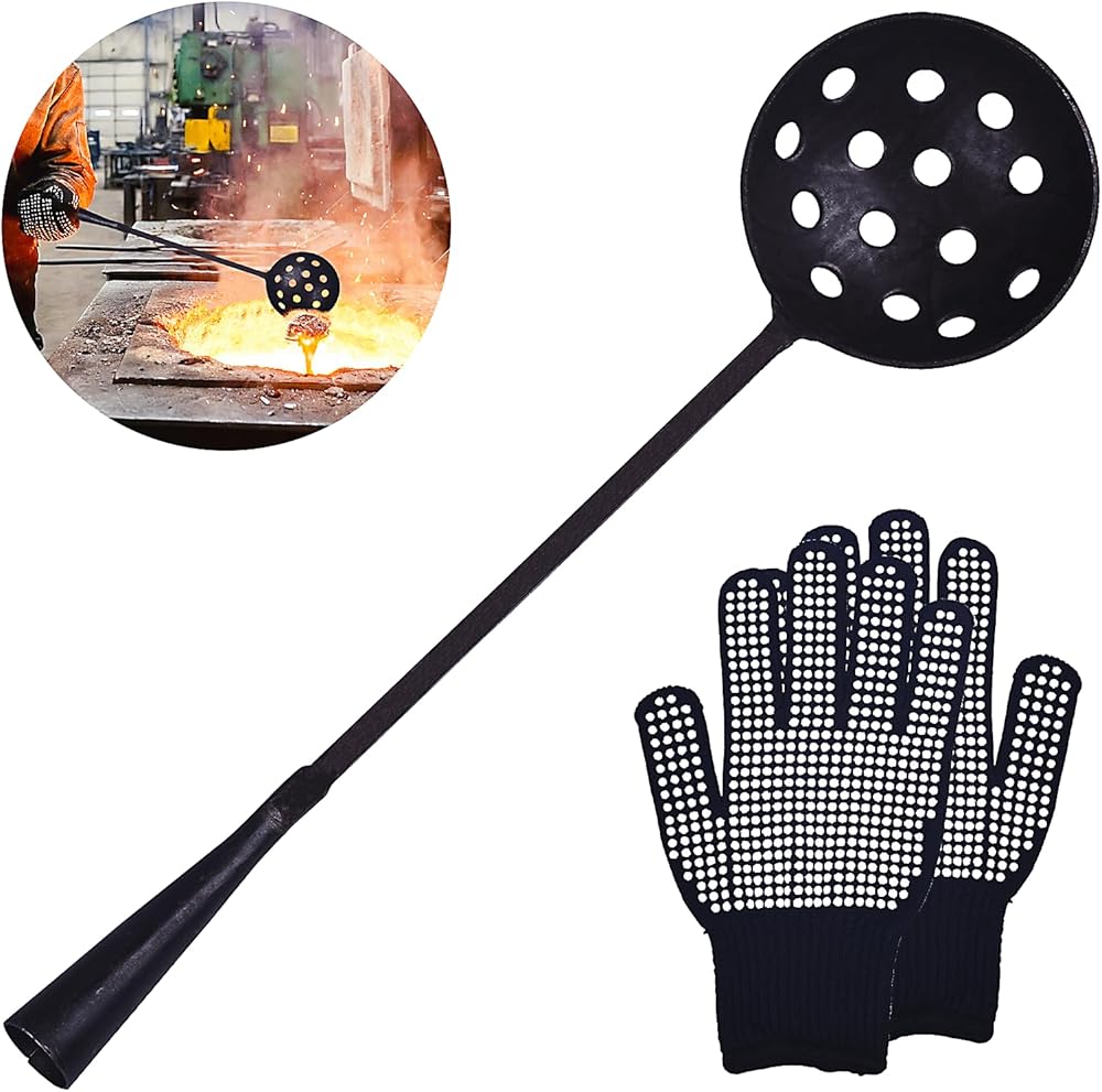 COMPLETE CASTING SOLUTION: Includes 1 metal casting skimmer (3.9" diameter spoon, 16.5" handle) and 1 pair of black anti-slip gloves with grip dots, providing a full setup for safe and efficient molten metal skimming.