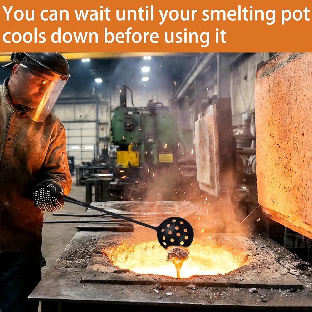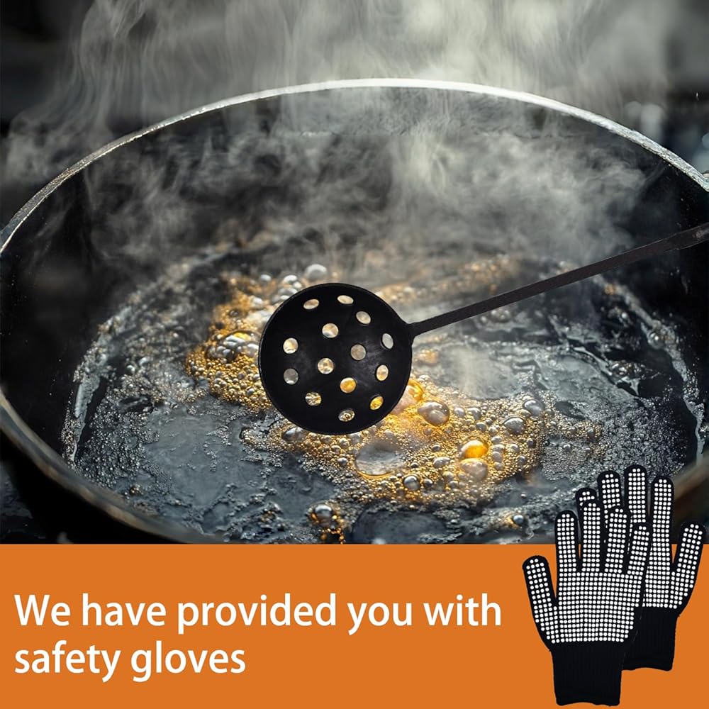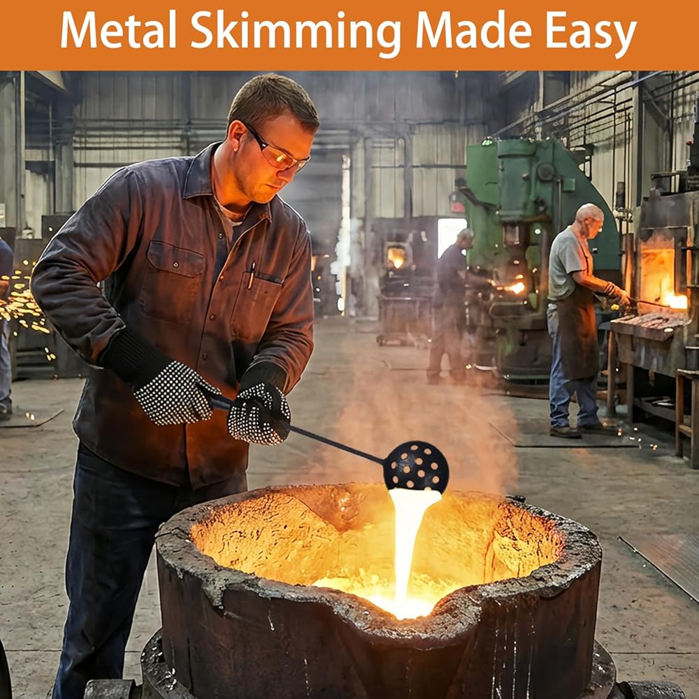 ENHANCED SAFETY: Oil-coated steel skimmer combined with heat-resistant anti-slip gloves minimizes burn risk and ensures a secure hold during metal casting operations.