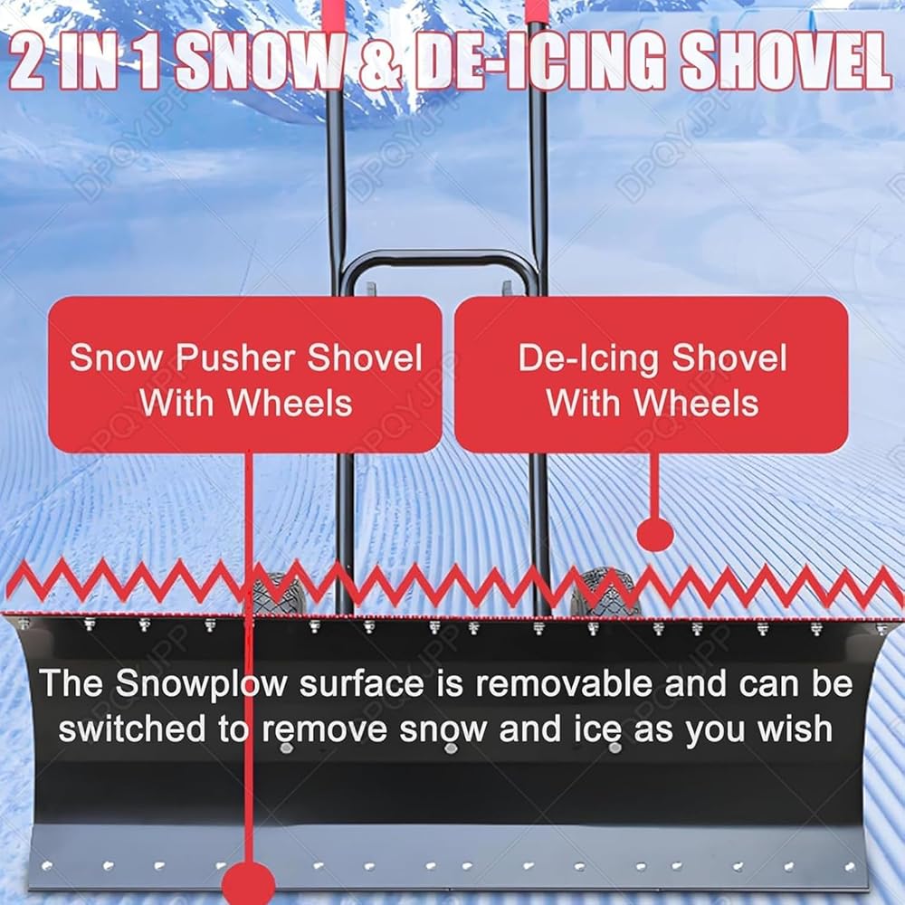 【2 in 1 snow shovel & ice shovel】: New push snow shovel with wheels uses upgraded double rod design,one side features a wide 42cm(16.54in) pusher for efficient snow removal, while the reverse side has sharp ice teeth to break through hardened ice. The reversible shovel head offers two tools in one—saving time and effort during in winter.