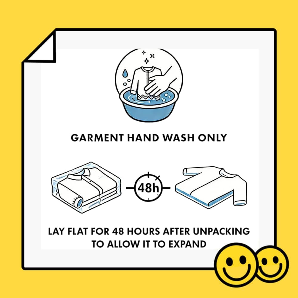 CARE INSTRUCTIONS: Hand wash only; The product is packaged in a compressed state and wrinkles are normal after unpacking; Lay flat and let it rest for 48 hours to naturally smooth out