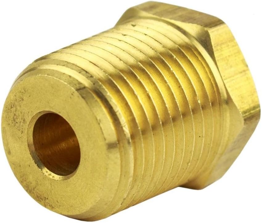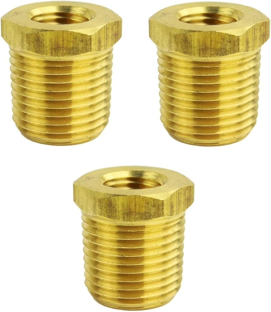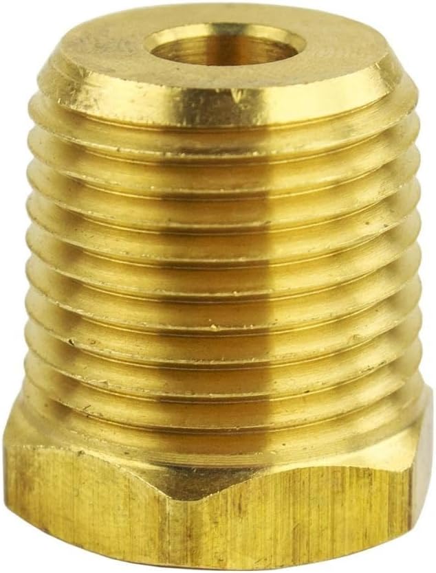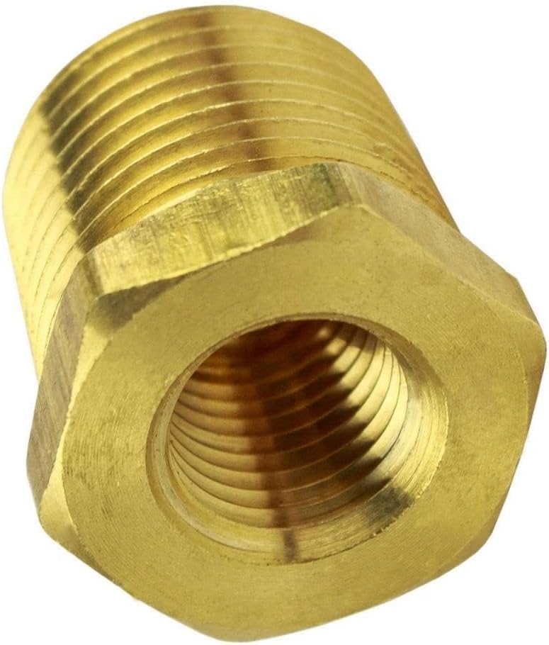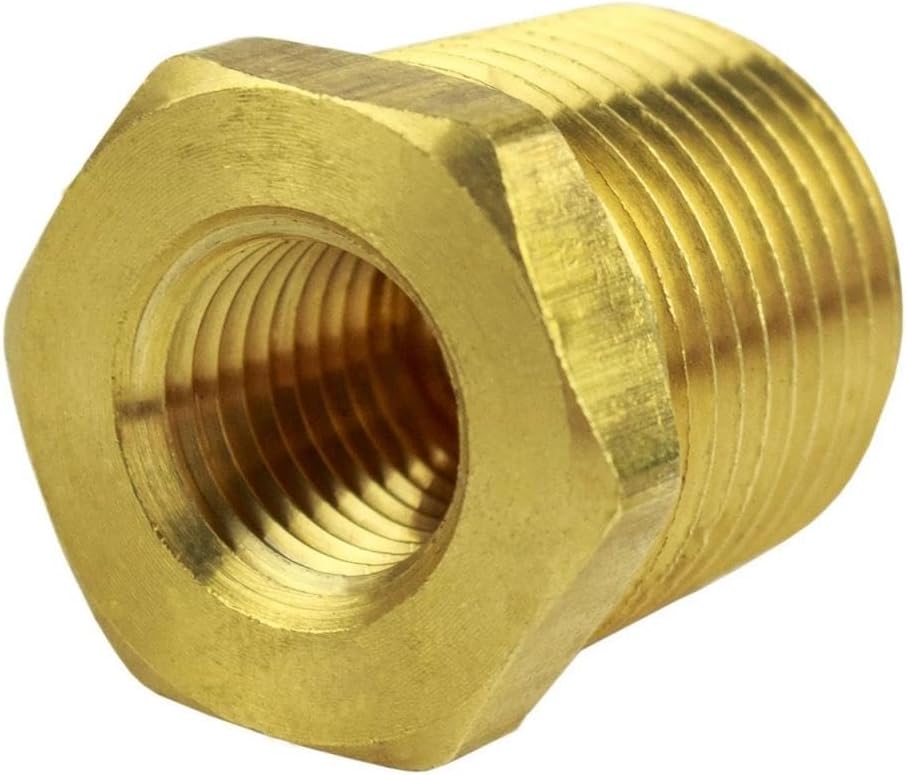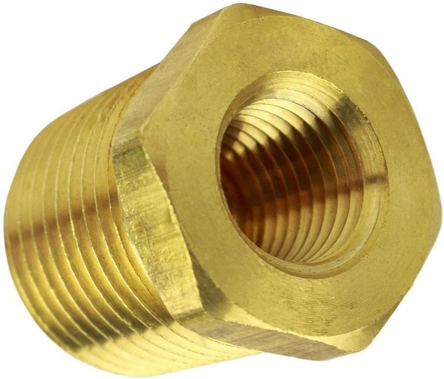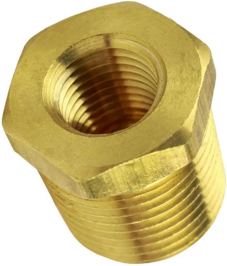 • Three 1/2" MNPT x 1/4" FNPT Solid Brass Pipe Thread Reducers These are 1/2" MNPT x 1/4" FNPT Solid Brass Pipe Thread Reducing Bushings that measure approximately 1" in length and need a 7/8" wrench to tighten. Specifications Typical Application: Air, Grease, Fuels, LP, and Natural gas, Refrigeration, Instrumentation and Hydraulic Systems Pressure: Operating Pressure Up To 1200 PSI Vibration: Fair Resistance Temperature Range: -65 to 250 Degrees Fahrenheit Used With: Brass, Bronze, Copper, Steel, Aluminum, and Iron Pipe Tolerance: +/- .02 On All Dimensions Note: 1/4" FNPT measures about 1/2" in diameter and 1/2" MNPT measures about 3/4" in diameter. This listing is for three (3) bushings.