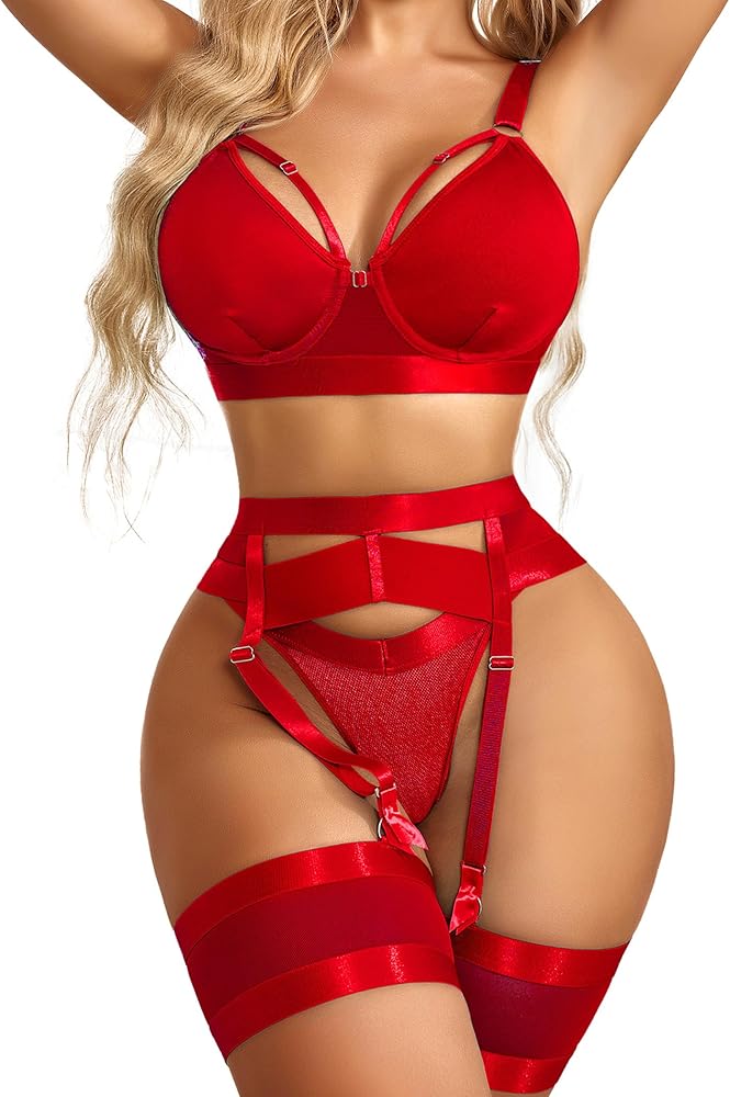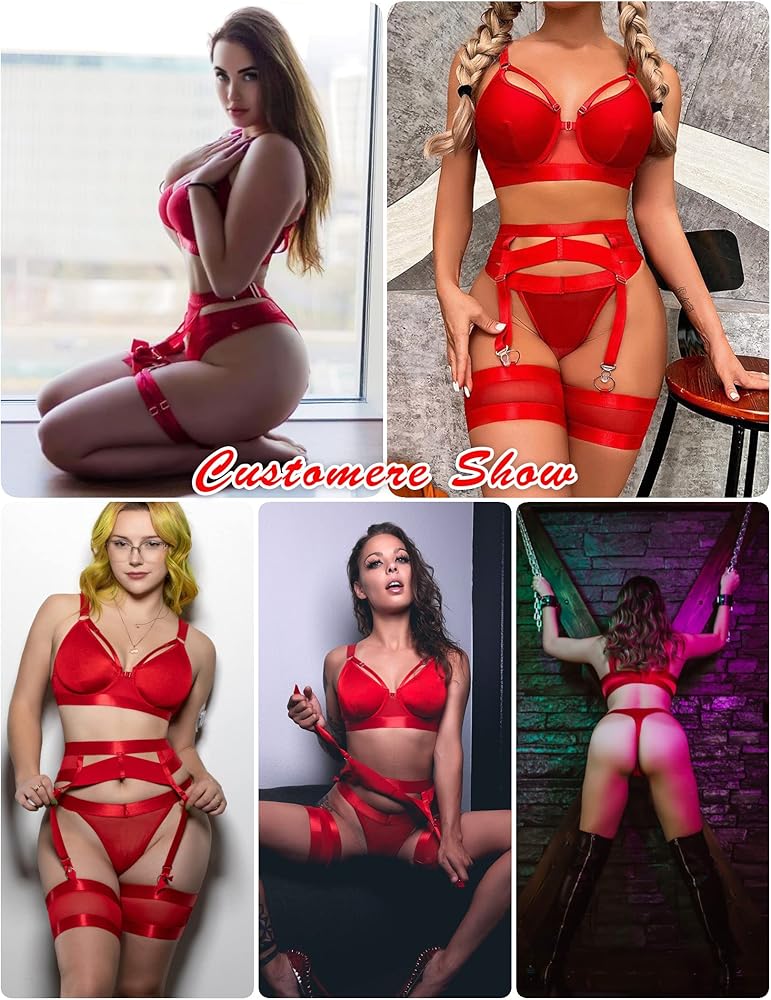 ✿النمط: مجموعة الملابس الداخلية ذات الأربطة المكونة من 4 قطع تأتي مع سروال داخلي متطابق على شكل حرف G وحزام فريد وأحزمة رباط، مما يعزز الأنوثة بشكل مثالي ويظهر منحنياتك، مما يجعلك أكثر سحرًا. حمالة الصدر تحتضن بشكل مثالي. لا يوجد انسكاب أو زلات.