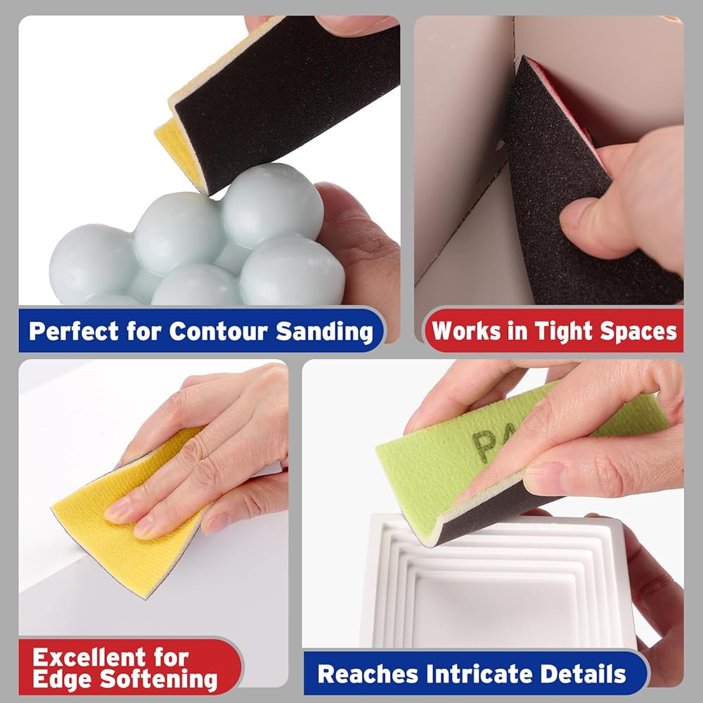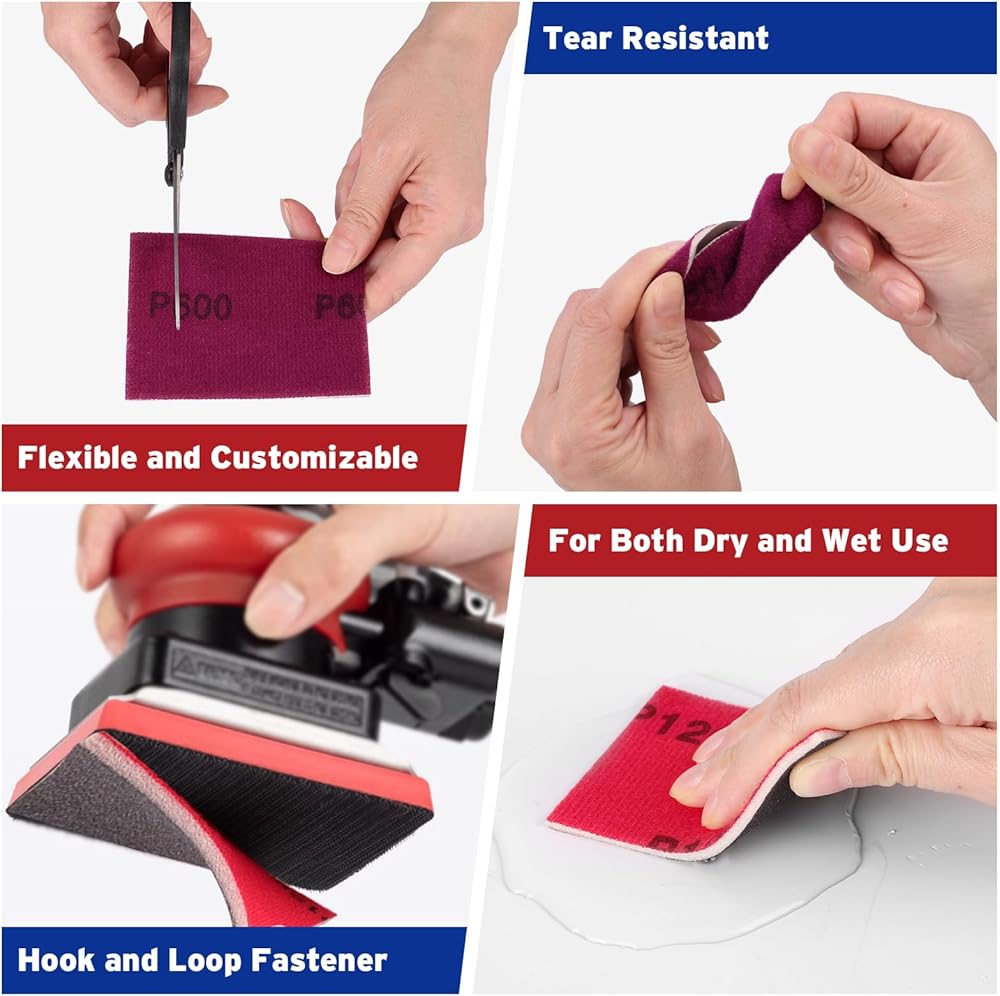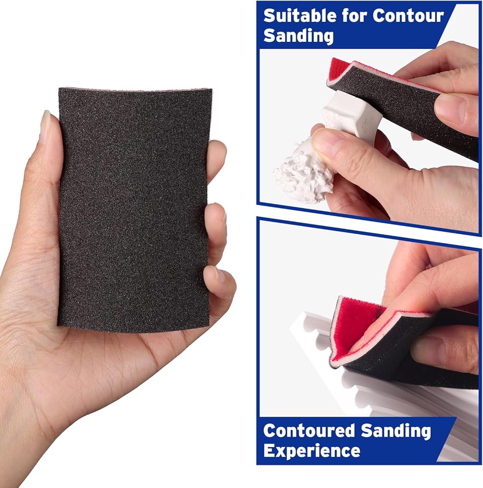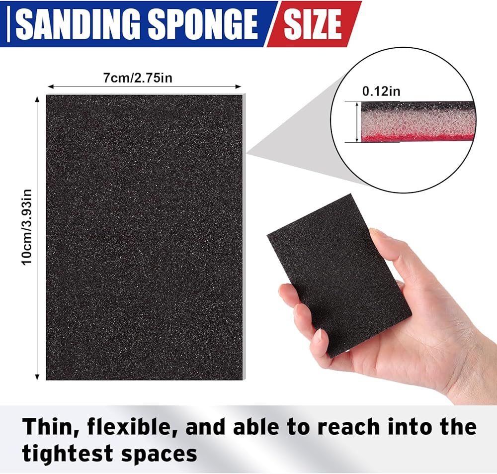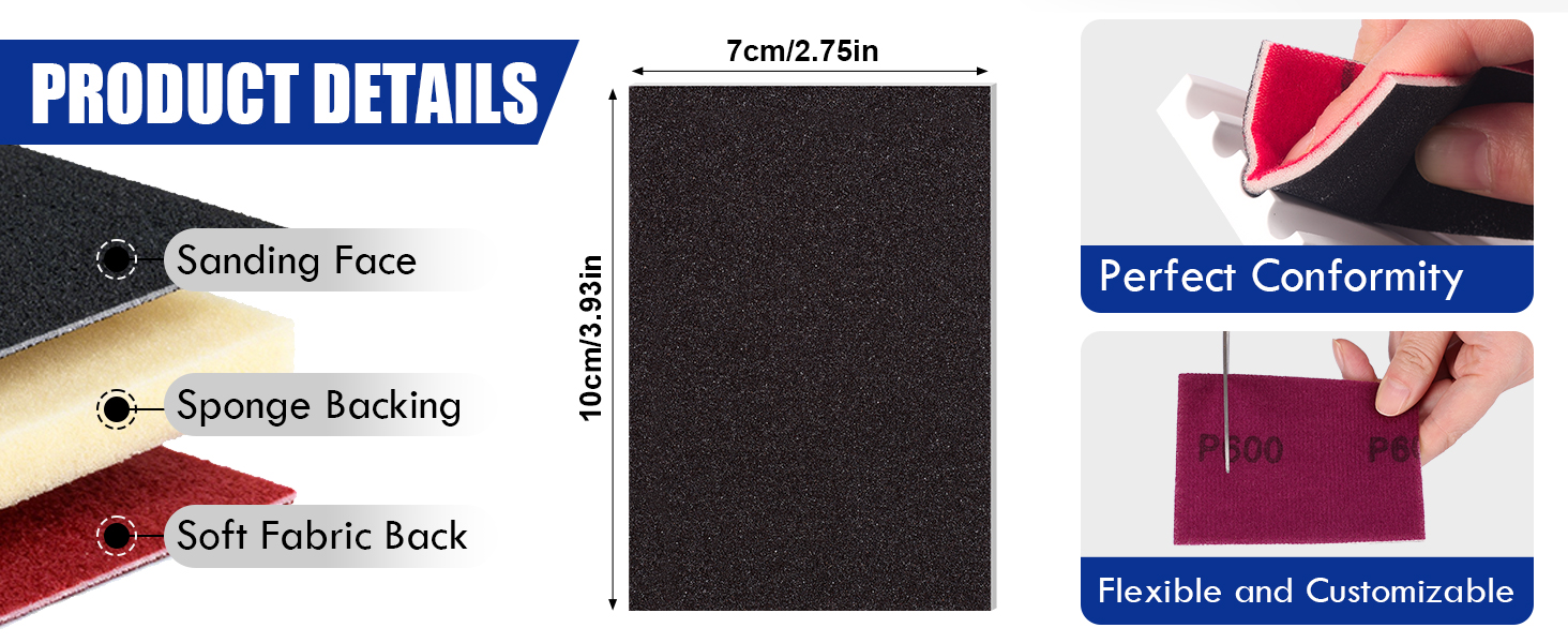 【تصميم مضغوط】: يبلغ مقاس كتلة الصنفرة 3.93 بوصة طول × 2.75 بوصة عرض × 0.12 بوصة ارتفاع. تتميز وسادات الصنفرة هذه بقاعدة إسفنجية ناعمة ومبطنة تسمح (ب) سهولة الانحناء أو القطع لتناسب مختلف الأشكال المعقدة مثل الحواف والأخاديد والأسطح المنحنية، مع توفير قبضة مريحة وغير قابلة للانزلاق.