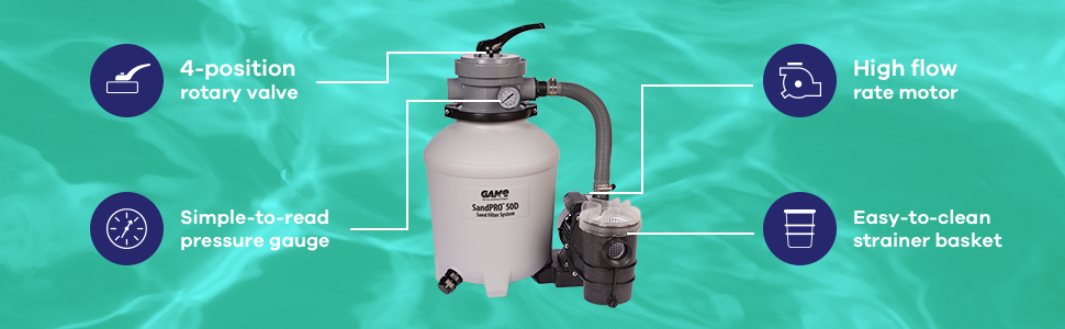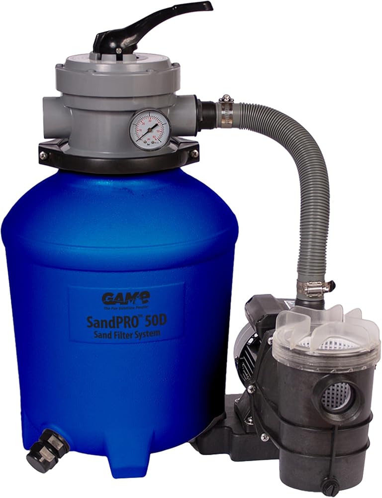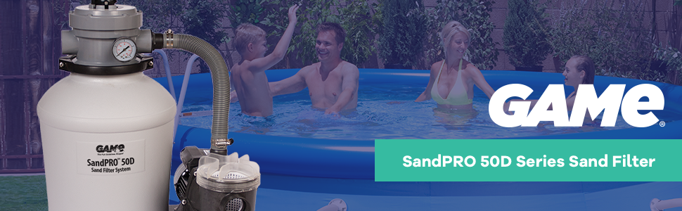 If your average Above-Ground swimming pool pump is just not good enough, GAME offers the superior engineered solution. The GAME sand Pro 50D series is an upgraded pump for Above-Ground pools that is compatible with index & most Common Above-Ground pools. The 50D series is a quality replacement filtration system that works best with index & best way pools but can be used with any Above-Ground pool. The ultra-quiet sand Pro pool-filter system features a motor with a high flow rate & 1/2 Horsepower (HP) pump, creating maximum energy efficiency. Game's 50D filter is for Above-Ground swimming pools holding up to 10, 000 gallon with a 40 GPM flow rate & requires 50 lb of medium-grade pool filtering sand (not included with purchase). our sand filter system has been designed with an easy-to-read pressure Gauge & large-capacity easy-to-clean hair & debris strainer basket with see-through lid. The ultra-quiet sand Pro pool-filter system features a motor with a high flow rate & 1/2 Horsepower (HP) pump, creating maximum energy efficiency & Operating with MAXIMUM vacuum power. Our cleaner for Above-Ground pools has been engineered for optimal cleaning efficiency, & with an easy-to-operate 4-position rotary valve that will filter, backwash, rinse, & winterize. Adapters that are included for Intex pools come with 32 mm, 40 mm, 1-1/4-in, & 1-1/2-in hose fittings. For pools up to 8, 000 gallon with a 37 GPM flow rate, use the sand Pro 35D (1/3 HP) pump. For pools up to 15, 000 gallon with a 52 GPM flow rate, use the sand Pro 75D (3/4 HP) pump. For added convenience, replacement parts for the sand Pro filters are exclusively available through GAME. This product is made by great American Merchandise & events (GAME). GAME is a cutting-edge innovator in the special event marketing & Merchandising Industries. Along with manufacturing & designing high-quality products, GAME also provides services to diverse nonprofit organizations that raise millions of dollars for charities across the globe.
