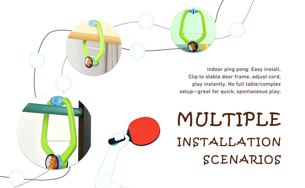 Easy Setup: Setting up this door pong game for kids is super straightforward! Just clip the device onto any stable door frame, adjust the cord to your desired length, and you're all set to play. No full ping pong table or complicated assembly required—perfect for spontaneous, hassle-free practice anytime