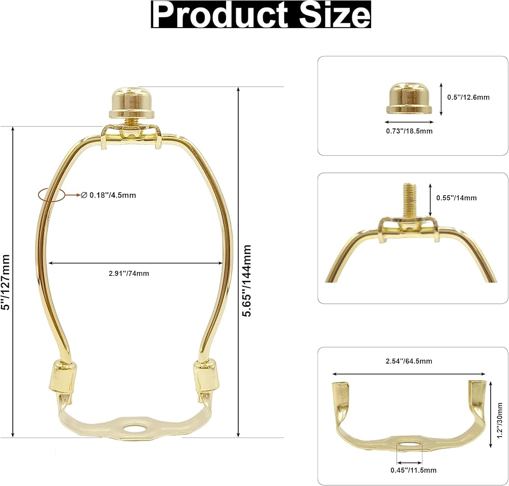 • 【Perfect Fit & Complete Kit】This 5-inch lamp harp is precision-engineered for a seamless fit. The top is designed to accommodate standard 1/4-27 thread finials or base, and can fit a 1/8IP (3/8 inch diameter) component. Your purchase includes a comprehensive hardware kit: 2 durable harps, 2 decorative knob caps, and 2 saddle base adapters.