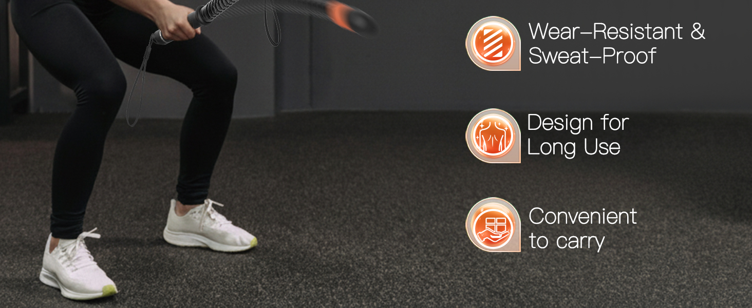 قبضة مريحة مع حركة سلسة: تم تصميم المقبض المريح المصنوع من المطاط اللدن حراريًا ليناسب الشكل الطبيعي لراحة يدك، مما يوفر قبضة آمنة وغير قابلة للانزلاق حتى أثناء التدريبات الطويلة. يسمح نظام الدوران الداخلي السلس بحركة سلسة ومتحكم بها، مما يساعد على تحسين الراحة والثبات مع تقليل الضغط غير الضروري على المعصمين للحصول على تجربة تدريب أكثر اتساقًا.