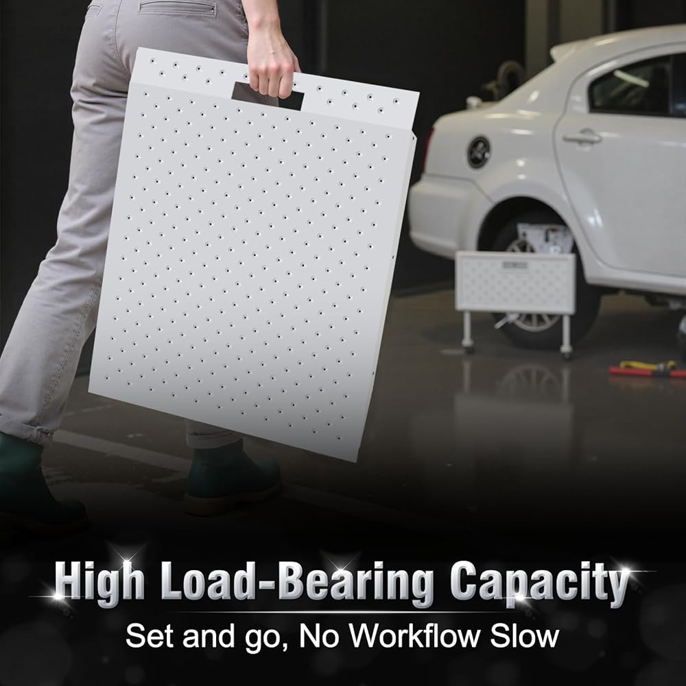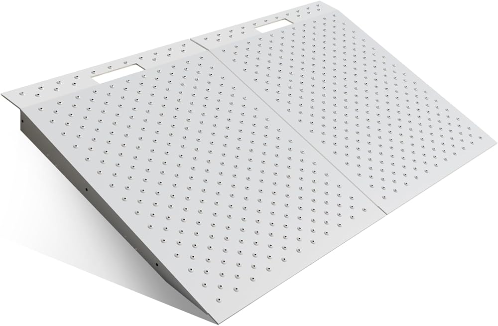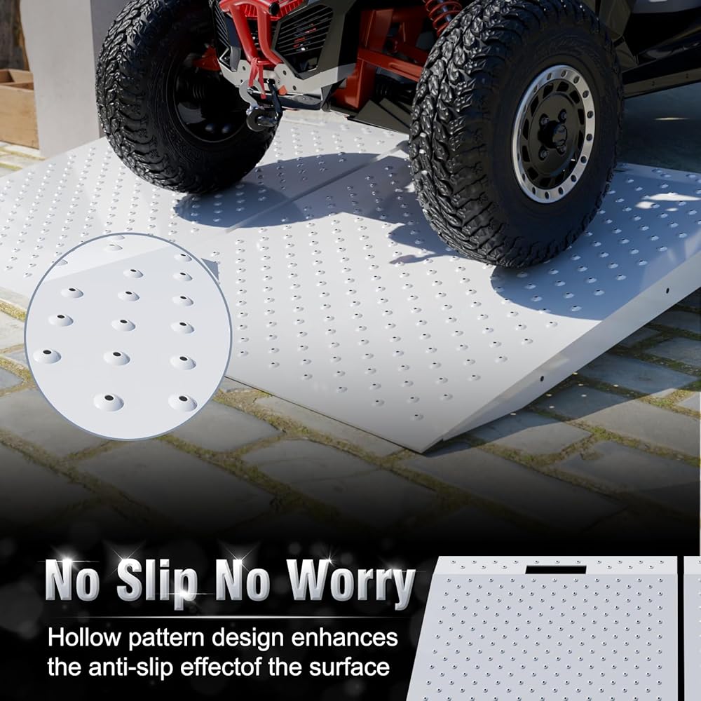 • Extra-Wide Anti-Slip Design: Features an optimized 12.7° incline angle for smooth entry and exit of riding mowers. Perforated plate traction surface ensures you always stand on solid ground—whether pushing your mower in the rain or simply grabbing tools.
