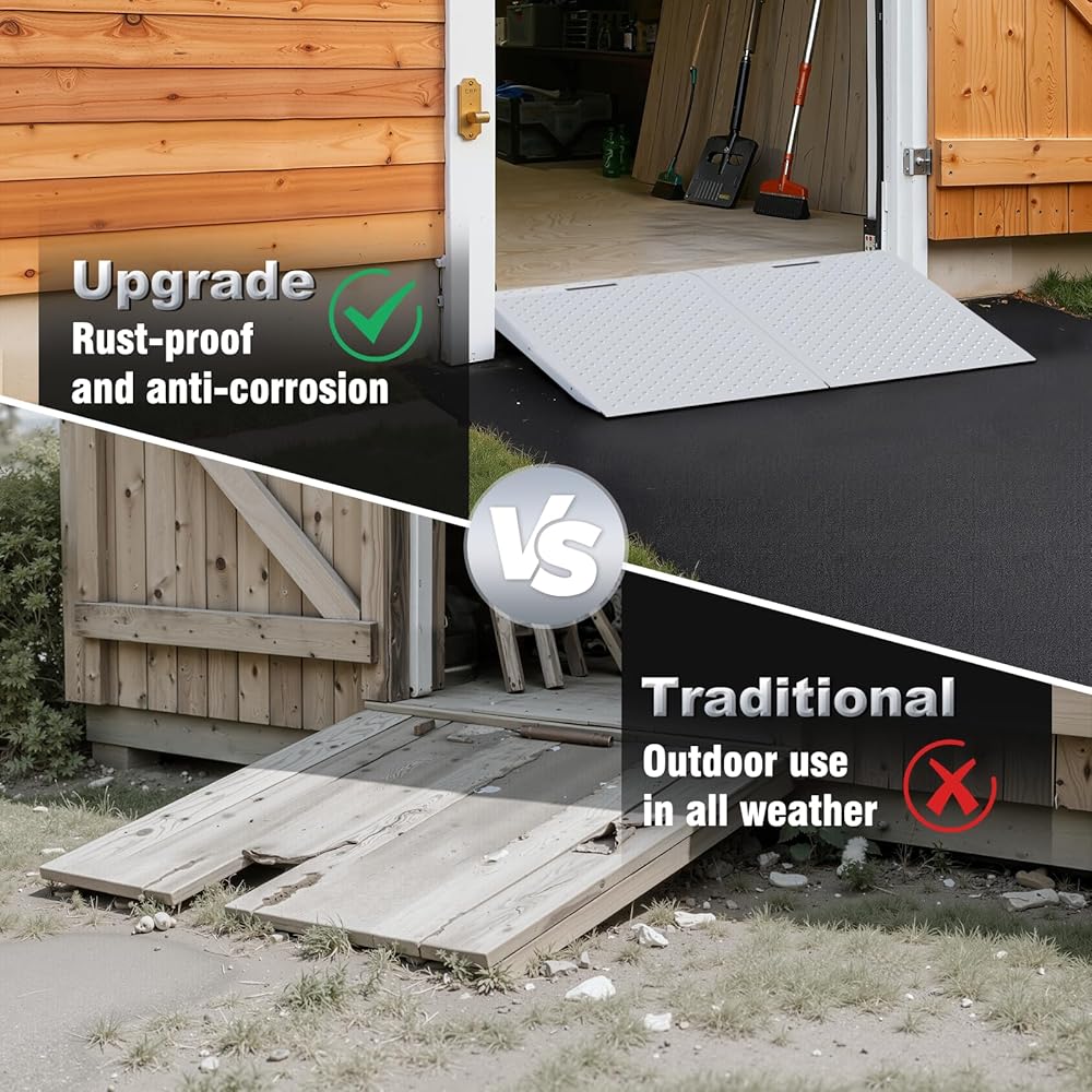 • All-Weather Durability - Unlike traditional wooden ramps that rot and wear easily, our shed ramp is built to last. Whether it's hot or cold, raining or snowing, it rust-free. It stays in great shape, ready for use anytime.