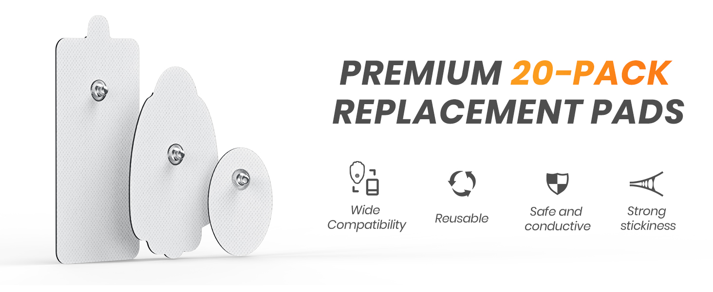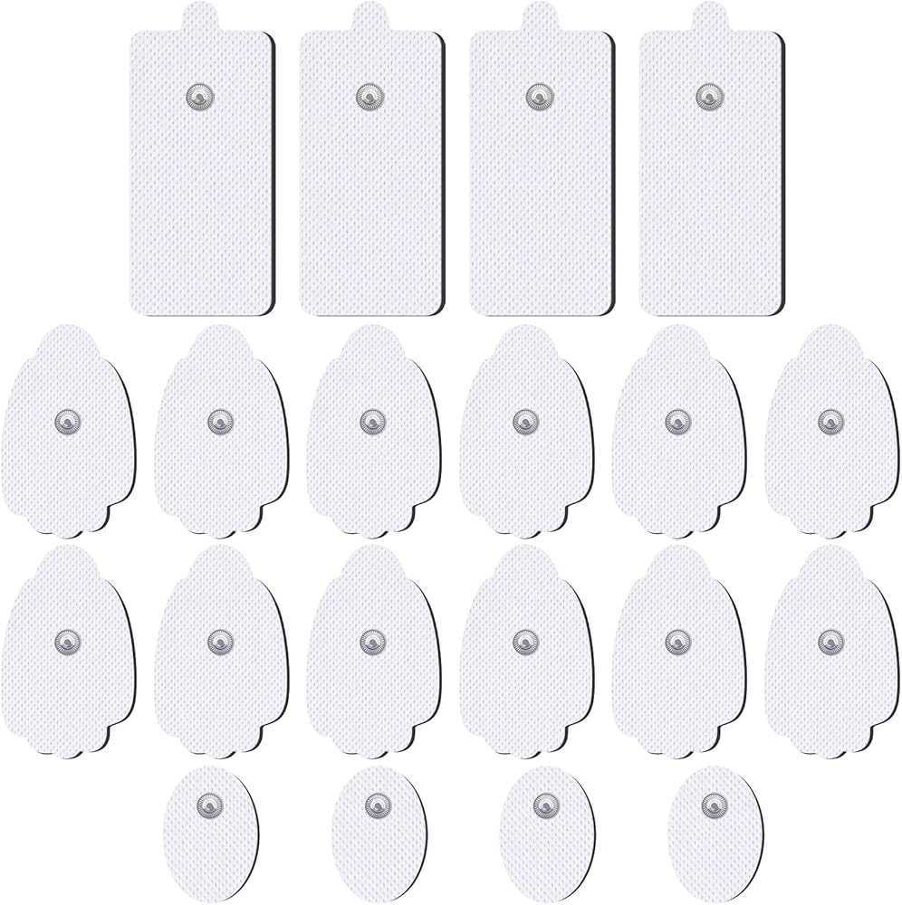 ما تحصل عليه: 20 قطعة من وسادات الأقطاب الكهربائية TENS (4 وسادات مستطيلة بمقاس 2 بوصة × 4 بوصة، و12 وسادة على شكل راحة بمقاس 2 بوصة × 3 بوصة، و4 وسادات بيضاوية بمقاس 1 بوصة × 2 بوصة).