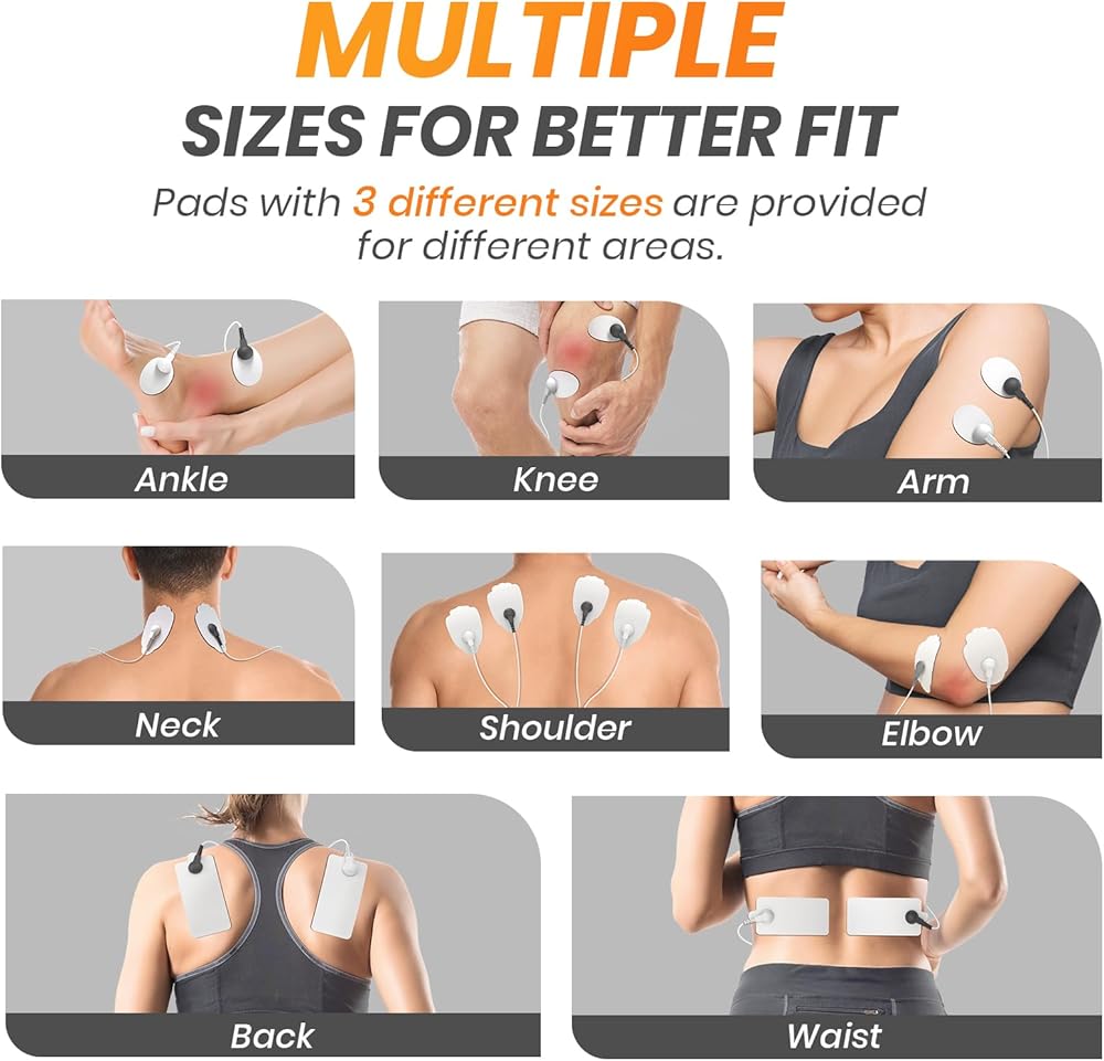 مجموعة متعددة الأحجام: يمكن تطبيق وسادات وحدة TENS البديلة بثلاثة أحجام مختلفة على أجزاء الجسم المختلفة لتخفيف الألم بشكل مستهدف. تعتبر الأقطاب الكهربائية على شكل راحة اليد مثالية لتخفيف آلام الخصر والفخذين والذراعين والكتفين والظهر. تعتبر وسادات آلة TENS المستطيلة مناسبة للمناطق الكبيرة من الخصر والفخذين ويمكن استخدام وسادات الأقطاب الكهربائية البيضاوية لتخفيف المفاصل أو المعصم.