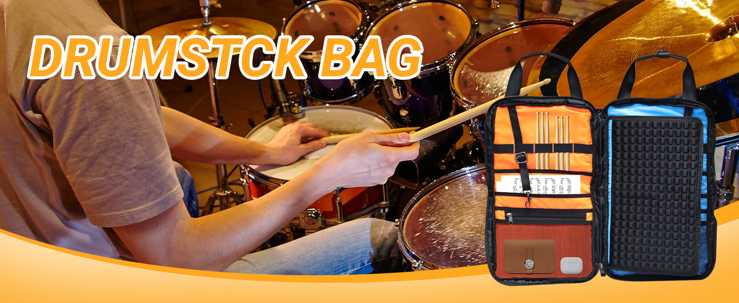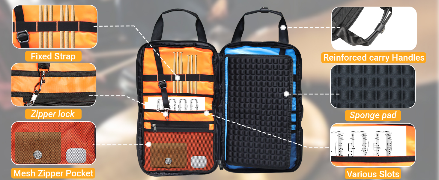 جيب تخزين أكبر: حقيبة أعواد الطبل مع جيب تخزين أكبر، يمكنك تخزين ملحقات الطبل المختلفة وفقًا لاحتياجاتك. تخزين أنيق، يسهل الحفاظ على إكسسوارات الطبل منظمة.