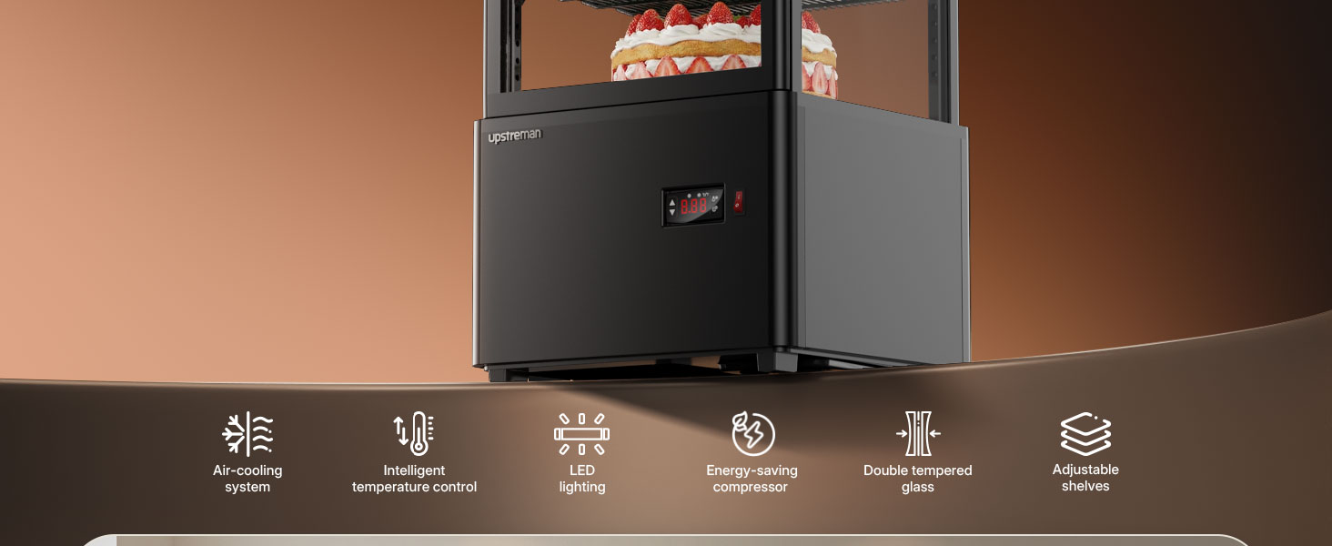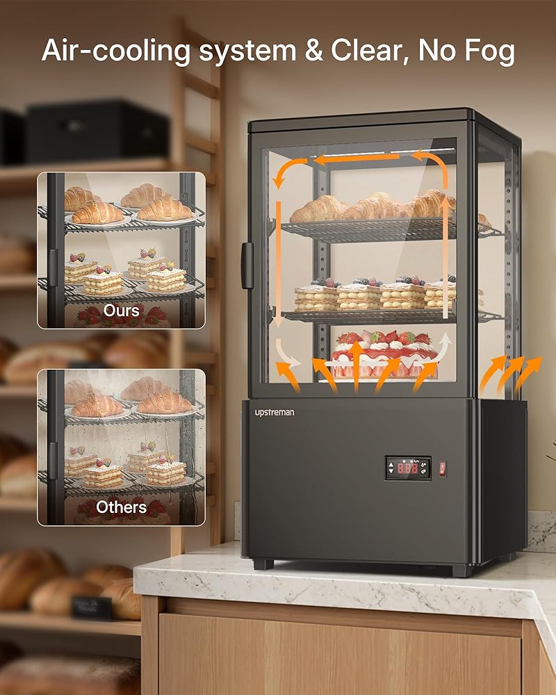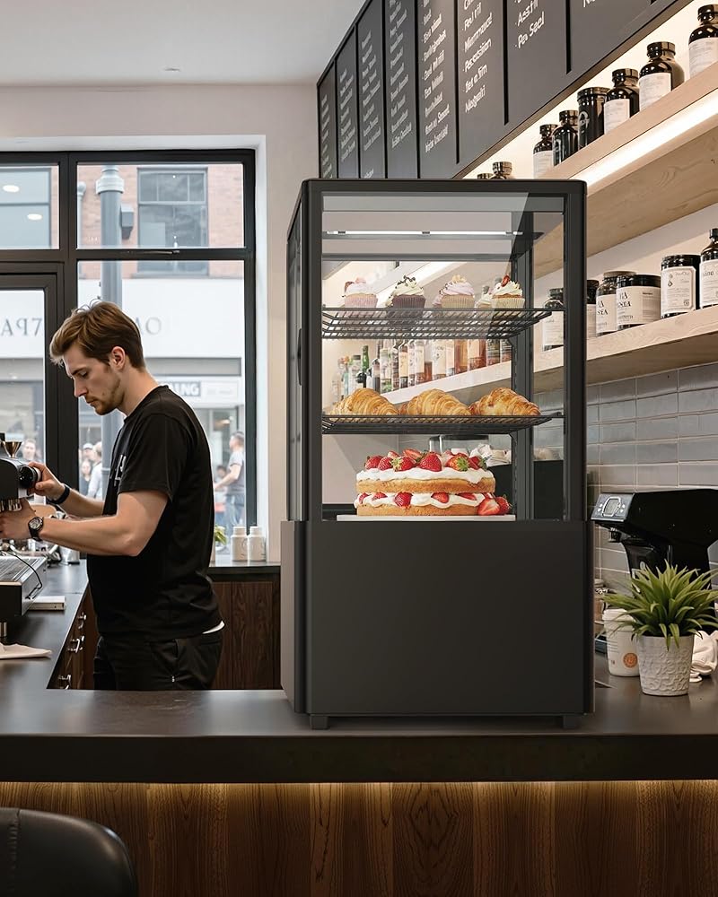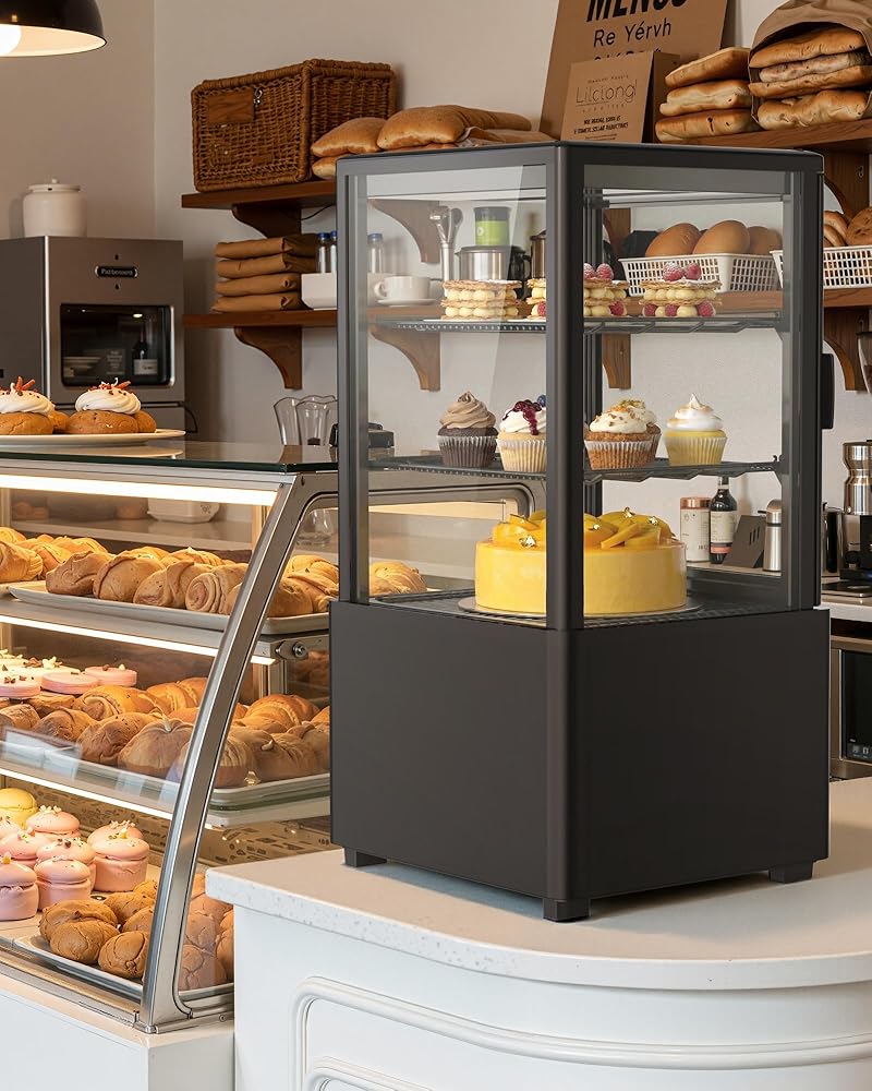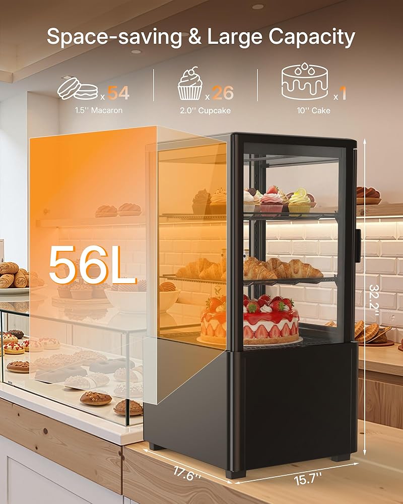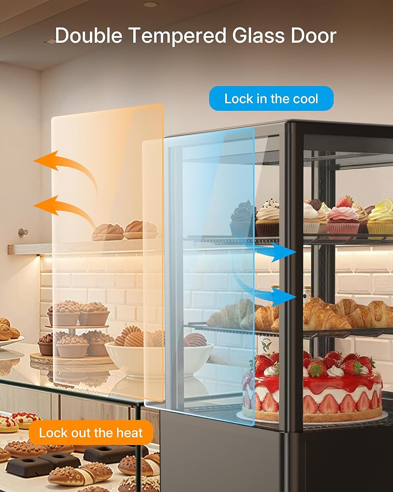 سعة كبيرة وعرض خالٍ من الضباب: يبلغ مقاس علبة عرض الكيك 17.6 بوصة عرضًا × 15.7 بوصة عمقًا × 32.2 بوصة ارتفاعًا. تتميز بزجاج مقسى مزدوج الطبقات من أربعة جوانب ووضع إزالة الجليد التلقائي، وتوفر عزلًا حراريًا ممتازًا وعرضًا واضحًا وخاليًا من الضباب، وتعرض المشروبات والحلويات والزبادي والفواكه والمزيد بشكل مثالي