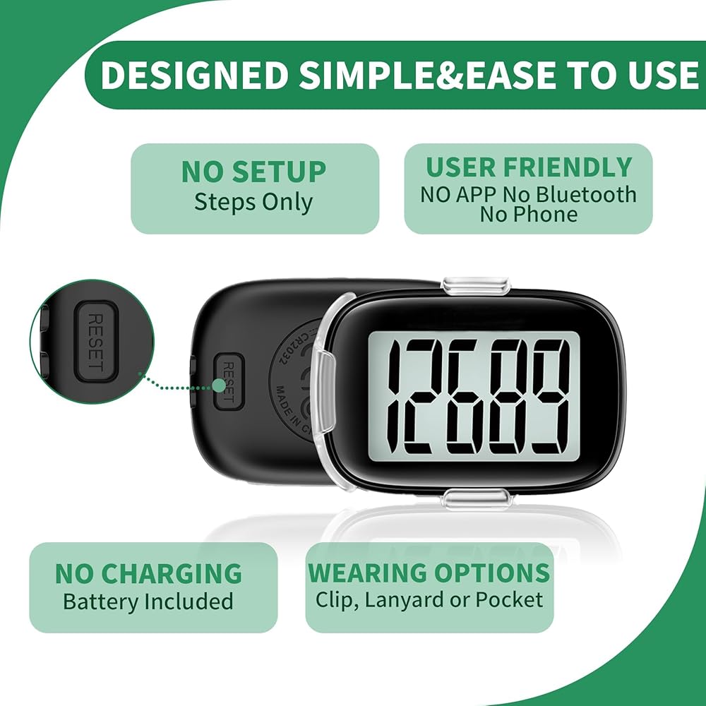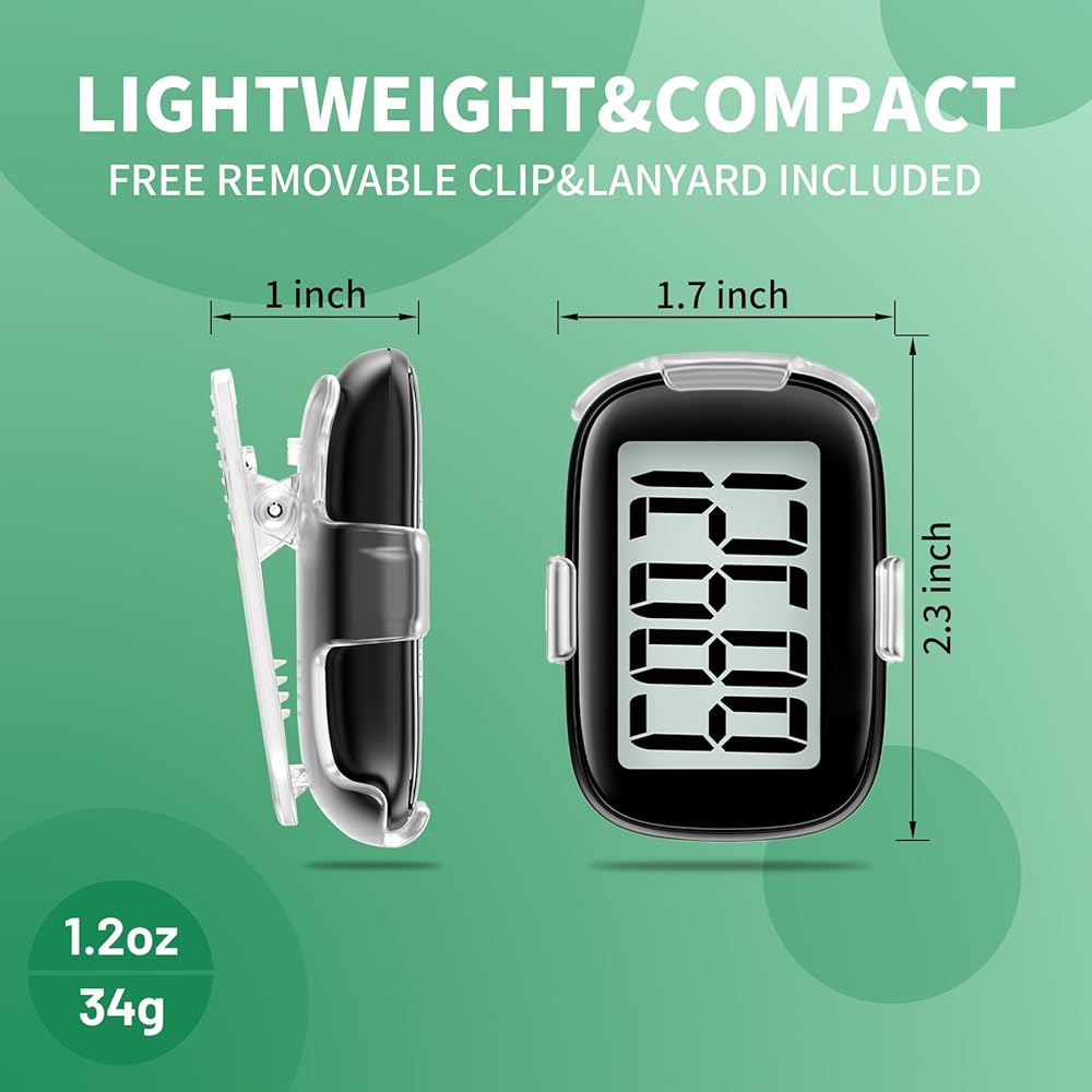 محمول وخفيف الوزن: يتميز عداد الخطى الأسود هذا بتصميم مدمج يسهل حمله. تأتي مع مشبك وحبل قابلين للفصل، ويمكن تثبيتها في الجيب أو الحزام أو تعليقها حول الرقبة أو وضعها في الجيب أو الحقيبة