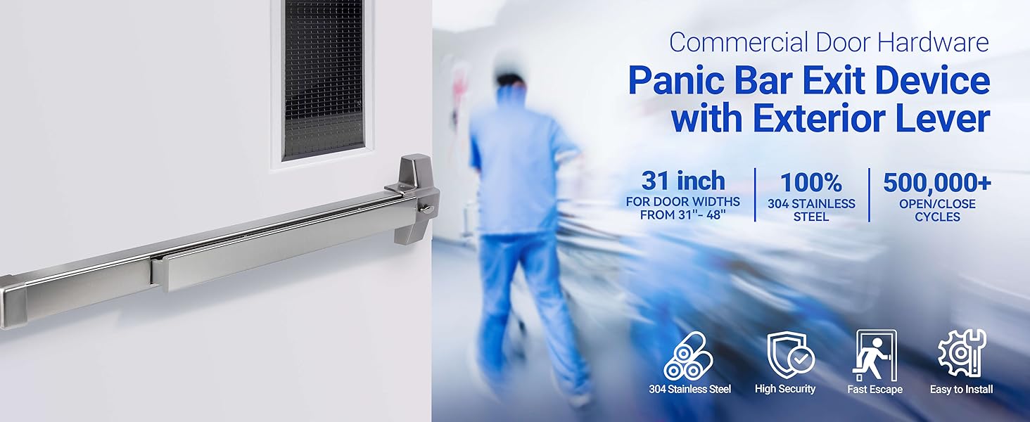 شريط دفع للباب التجاري مقاس 31 بوصة مع غطاء خلفي من الفولاذ المقاوم للصدأ 304، جهاز خروج الذعر من الدرجة الأولى مع مقبض رافعة خارجي و6 مفاتيح، أجهزة طوارئ شديدة التحمل للأبواب المعدنية/الخشبية in Kuwait