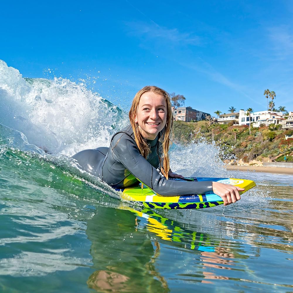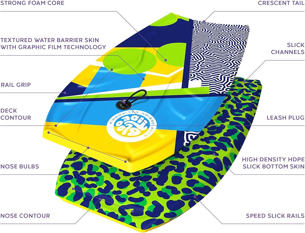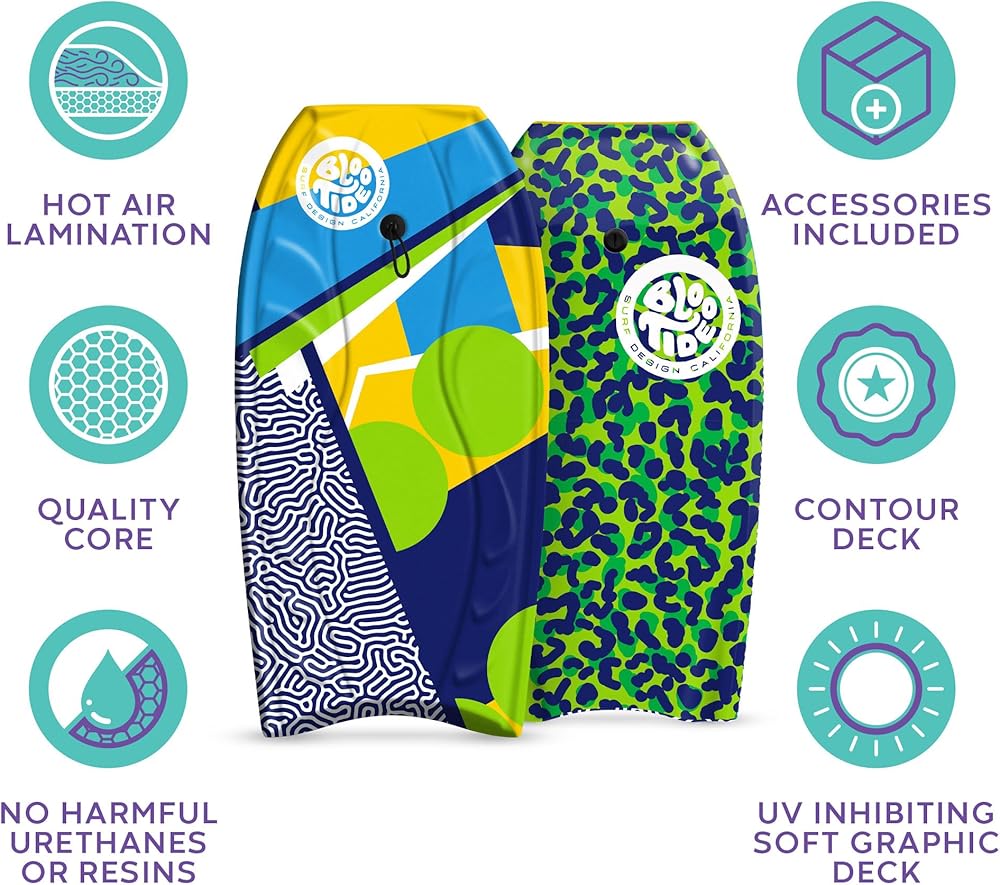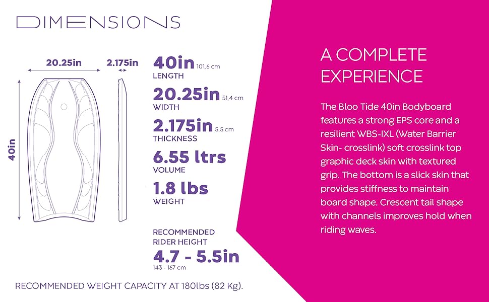 • أبعاد لوح الجسم Bloo Tide مقاس 40 بوصة هي 40 بوصة طول × 20.25 بوصة عرض × 2.175 بوصة سمك | الوزن 1.8 رطل | الحجم 6.55 لتر | سعة الوزن الموصى بها 180 رطل. ممتاز للشباب والكبار. مزدهر وصلب بما يكفي لركوب الأمواج.