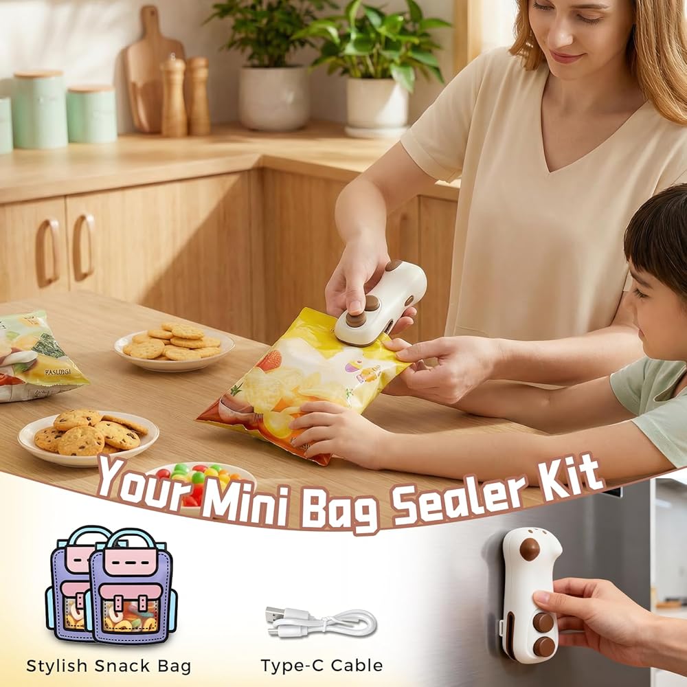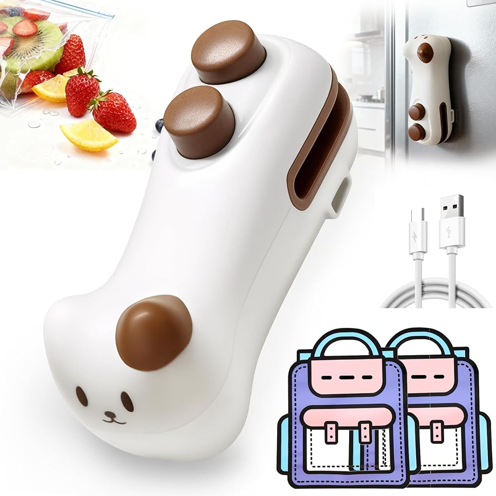 سدادة الأكياس، 2 في 1 حقيبة صغيرة قابلة لإعادة الشحن مع قاطع ومغناطيس، سدادة حرارية صغيرة للوجبات الخفيفة، آلة ختم صغيرة التصميم محمولة للمطبخ مع حقيبة وجبات خفيفة لطيفة (رمادي)