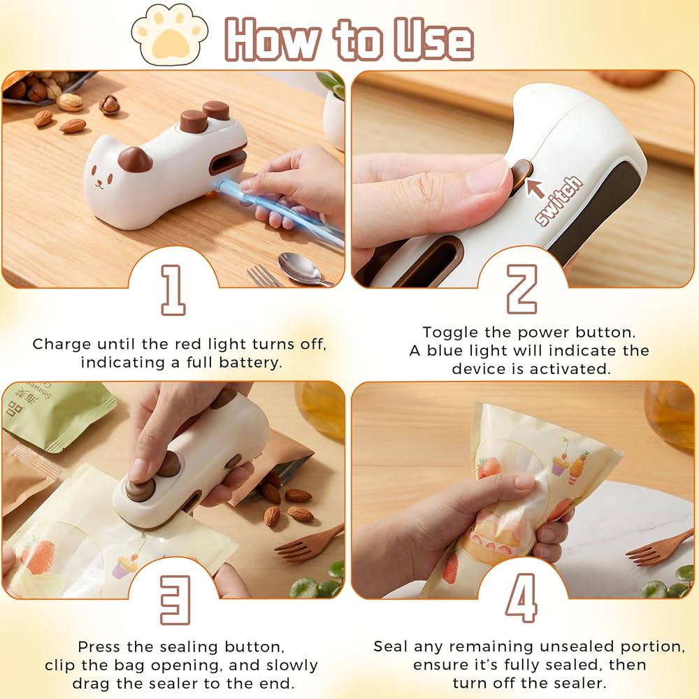 يدمج التصميمان في واحد وظائف الختم والقطع، بنقرة واحدة للتبديل لسهولة التشغيل. يمكنها إغلاق وتقطيع الوجبات الخفيفة والمكسرات وأكياس تغليف الشاي بسرعة، مما يوفر راحة كبيرة لتغليف الطعام اليومي. مناسبة لربات البيوت والعاملين في المكاتب وعشاق التخييم، وهي أداة عملية لتحقيق حياة عالية الجودة وتخزين الطعام بشكل مريح.