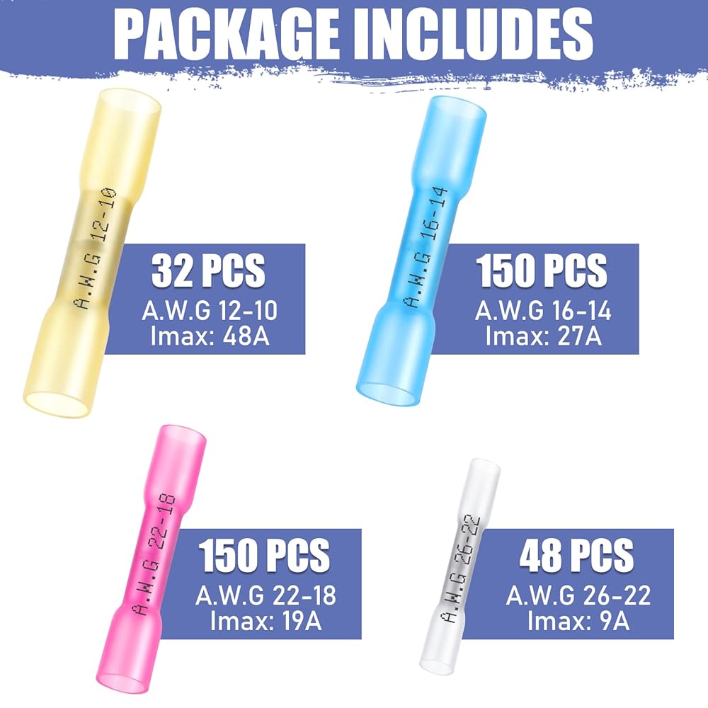 الموصلات الكهربائية المتوافقة مع المعايير ذات الصلة: إجمالي 380 قطعة من مجموعة موصلات المؤخرة المنكمشة بالحرارة (150 قطعة باللون الأحمر: 22-18A.W.G. / 150 قطعة باللون الأزرق: 16-14A.W.G. / 32 قطعة باللون الأصفر: 12-10A.W.G. / 48 قطعة باللون الأبيض: 26-24 أ.و.ج). معبأة في علبة لطيفة مع ملصق مرجعي. موصلات الأسلاك المقاومة للماء المنكمشة بالحرارة متوافقة مع معايير ROHS وISO 9001:2008 وSGS وCE