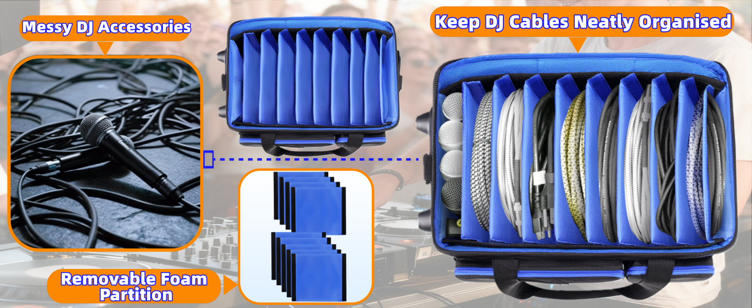 فواصل قابلة للفصل ومبطنة داخلية: تتميز حقيبة DJ الخاصة بنا بـ 9 فواصل قابلة للإزالة مبطنة بالإسفنج لتوفير حماية فائقة للكابلات والملحقات. تمتص البطانة التأثيرات بينما تسمح لك بتخصيص التصميم - مما يؤدي إلى إنشاء ما يصل إلى 10 حجرات لتنظيم ملحقات DJ بشكل أنيق. تعتبر الحجرة العلوية لحقيبة الكابل مع فتحة سحاب على شكل حرف D مثالية لملحقات DJ التي تحتاجها بشكل متكرر.