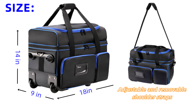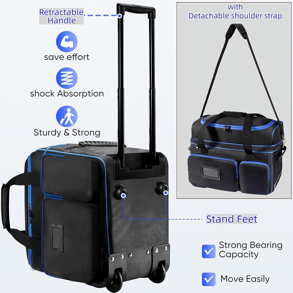 طرق متعددة للحمل وعجلات سهلة التدحرج: توفر حقيبة كابل DJ الدوارة 3 طرق حمل مريحة. قم بلفها بسلاسة على الطين والأسمنت والأسطح المختلفة بعجلات كبيرة ومقبض تلسكوبي قوي. استخدم حزام الكتف المبطن للحمل بكتف واحد أو الرفع بواسطة المقبض الجانبي، وكلاهما يتميز بوسائد ناعمة وسميكة للحمل المريح على المدى الطويل. عند السفر بالسيارة أو الطائرة، يمكن وضع حقيبة منظم الكابلات في صندوق السيارة الخاص بك وحملها دون شغل مساحة زائدة.