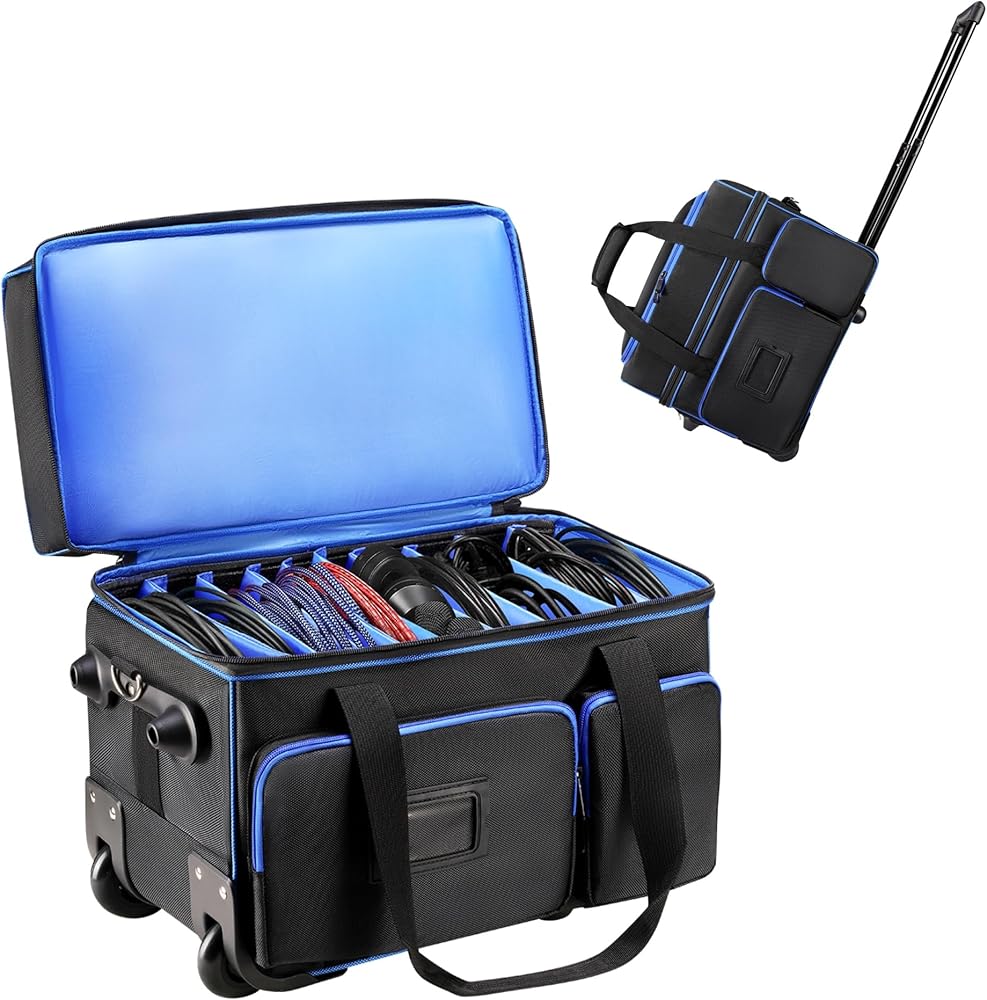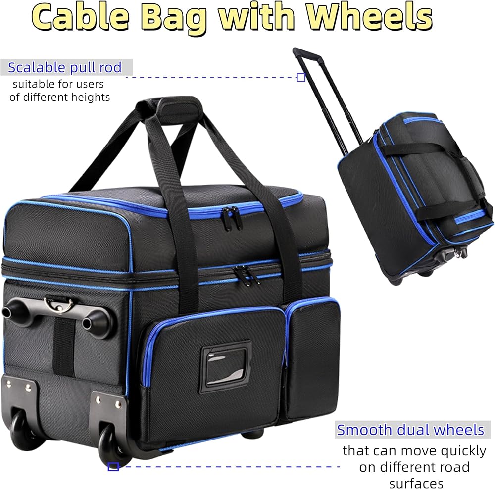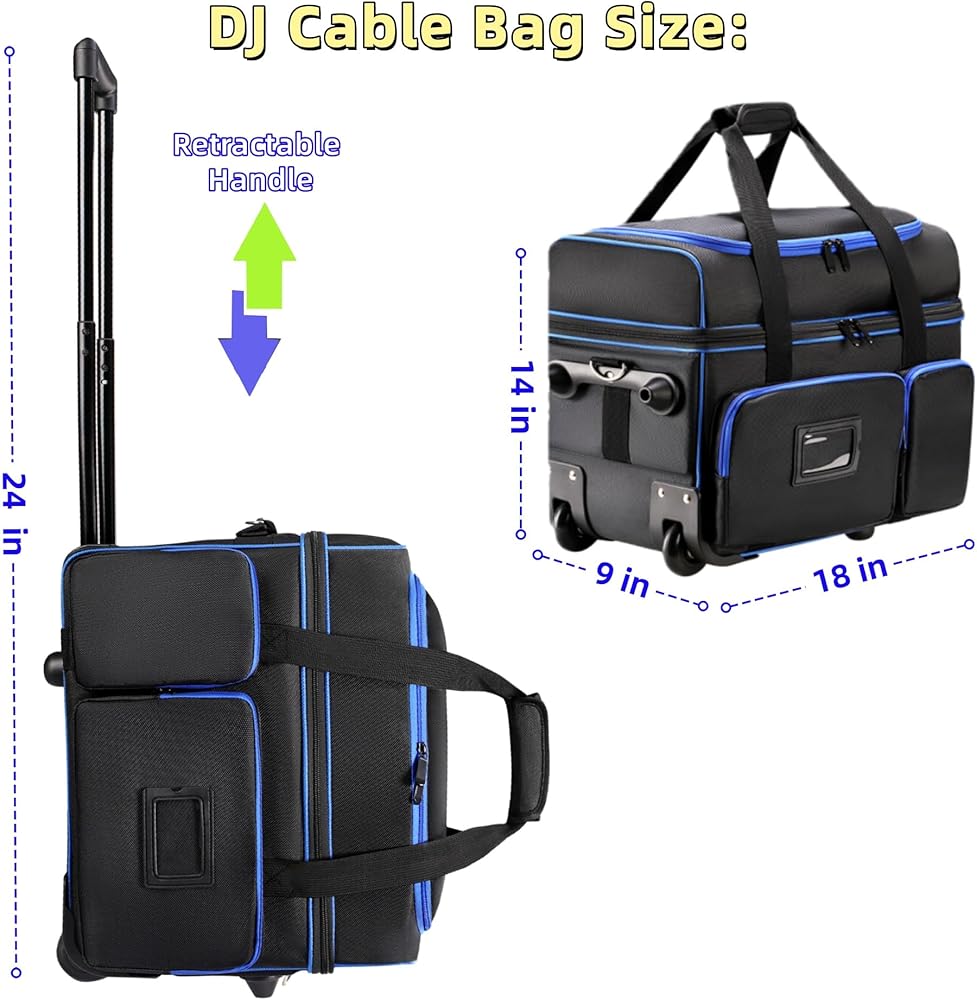 حقيبة تنظيم كابل DJ مع عجلات، حقيبة ناعمة لمعدات DJ مع 9 فواصل قابلة للفصل، حقيبة تخزين مبطنة متعددة الجيوب للميكروفون والسلك وسماعات الرأس وإكسسوارات الموسيقى
