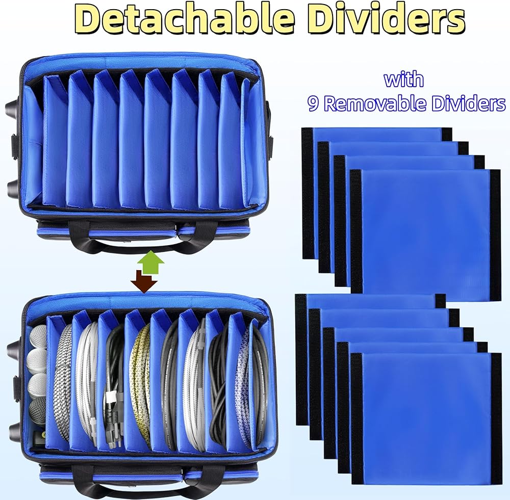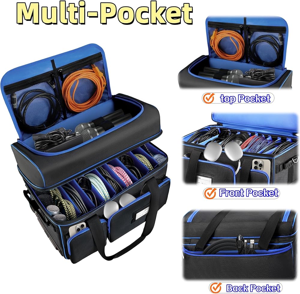 سعة كبيرة وتنظيم دي جي: تتميز حقيبة منظم الكابلات الناعمة هذه بتصميم ذكي مزدوج الطبقة. حقيبة كابل دي جي كبيرة مقاس 18 × 14 × 9 بوصة مع عجلات تتميز بحجرة رئيسية كبيرة مع فواصل قابلة للفصل، وجيب علوي للميكروفون/الكابل، وجيبين خارجيين بسحاب، وجيبين شبكيين للضروريات الصغيرة. وتتميز حقيبة دي جي هذه ببطانة زرقاء عالية الوضوح لسهولة الرؤية والوصول السريع إلى أغراضك، حتى في البيئات ذات الإضاءة الخافتة مثل المسرح أو دي جي المحمول كشك