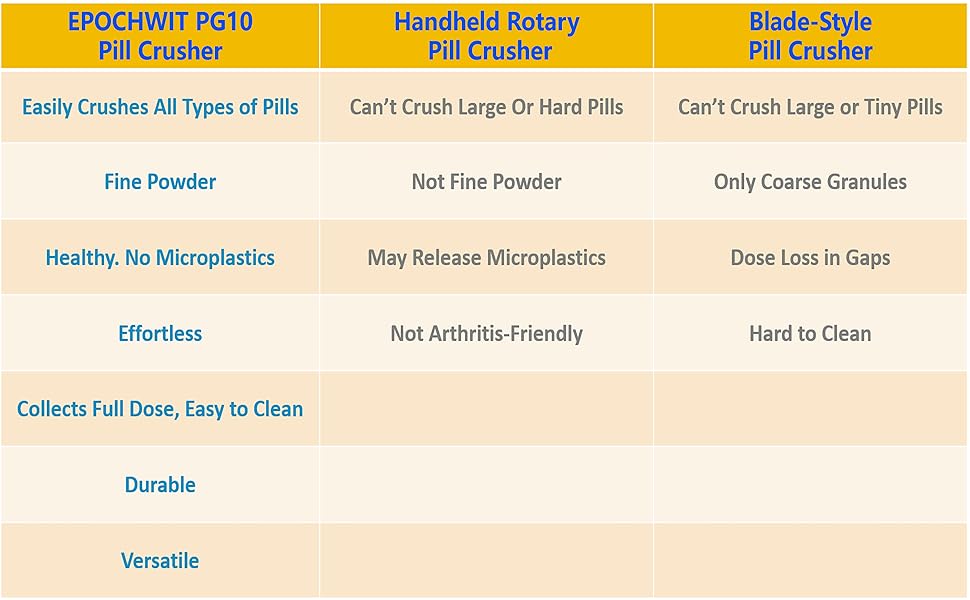 سهل الاستخدام والتنظيف: يتميز بملاط ومدقة مريحة تجعل أقراص الطحن سريعة وفعالة. السطح الداخلي أملس وغير ملحوم، مما يجعل من السهل جمع كل المسحوق وضمان عدم فقدان أي جرعة. تساعدك الفرشاة المرفقة على جمع المسحوق وتنظيف الكسارة بسهولة. القاعدة المطاطية القابلة للإزالة لن تلحق الضرر بسطح الطاولة، بينما يساعد الغطاء شبه الشفاف المرفق على منع انسكاب المسحوق. إنه مفيد بشكل خاص لكبار السن.