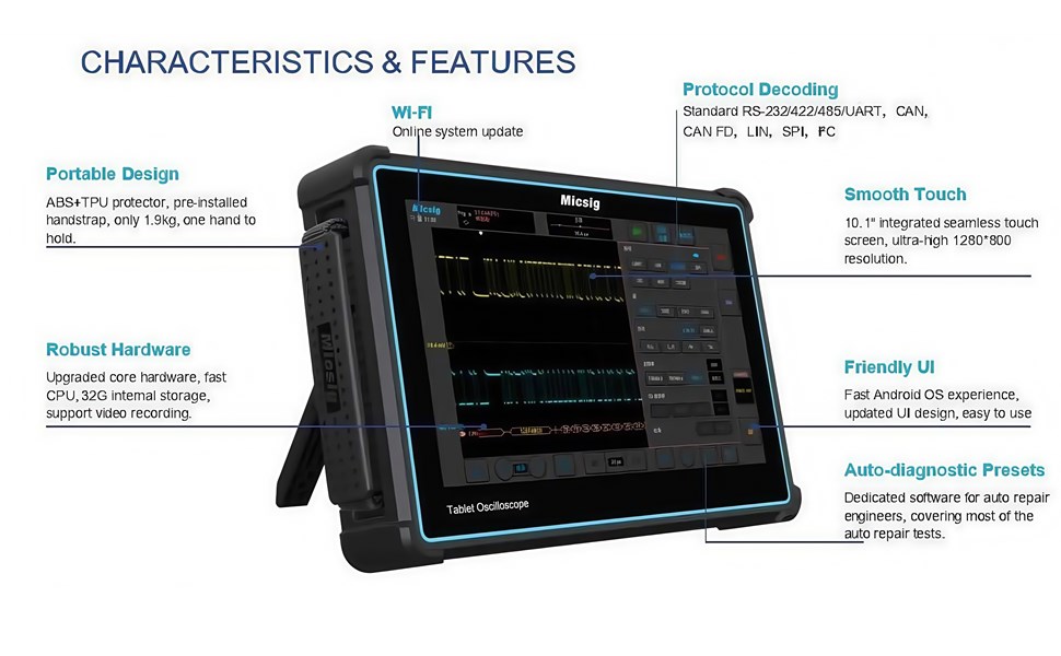 [شاشة لمس عالية الدقة مقاس 10.1 بوصة] يتميز جهاز راسم الذبذبات Micsig ATO1004 بشاشة TFT-LCD عالية الدقة مقاس 10.1 بوصة مقاس 1280 × 800 مع دعم شبكة 11 × 10، مما يوفر تحكمًا دقيقًا باللمس وتصورًا موجيًا مثاليًا للتشغيل الفعال