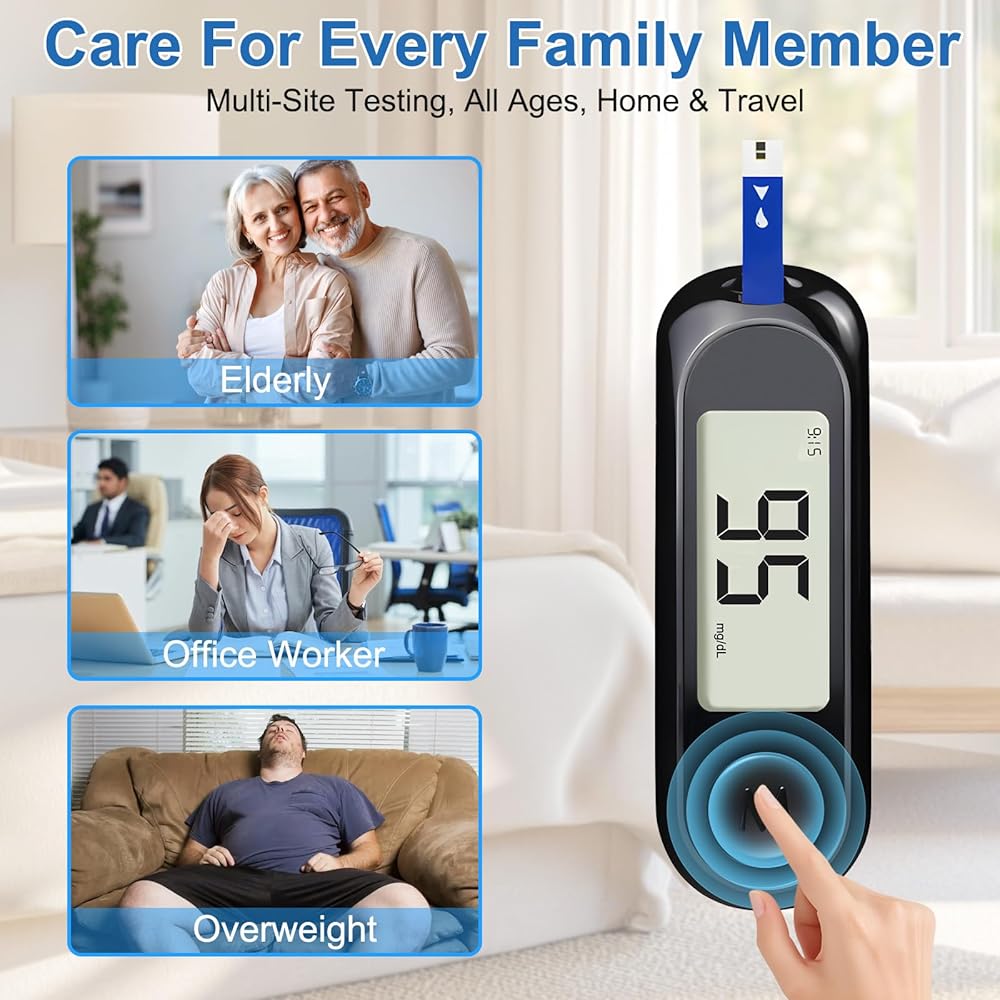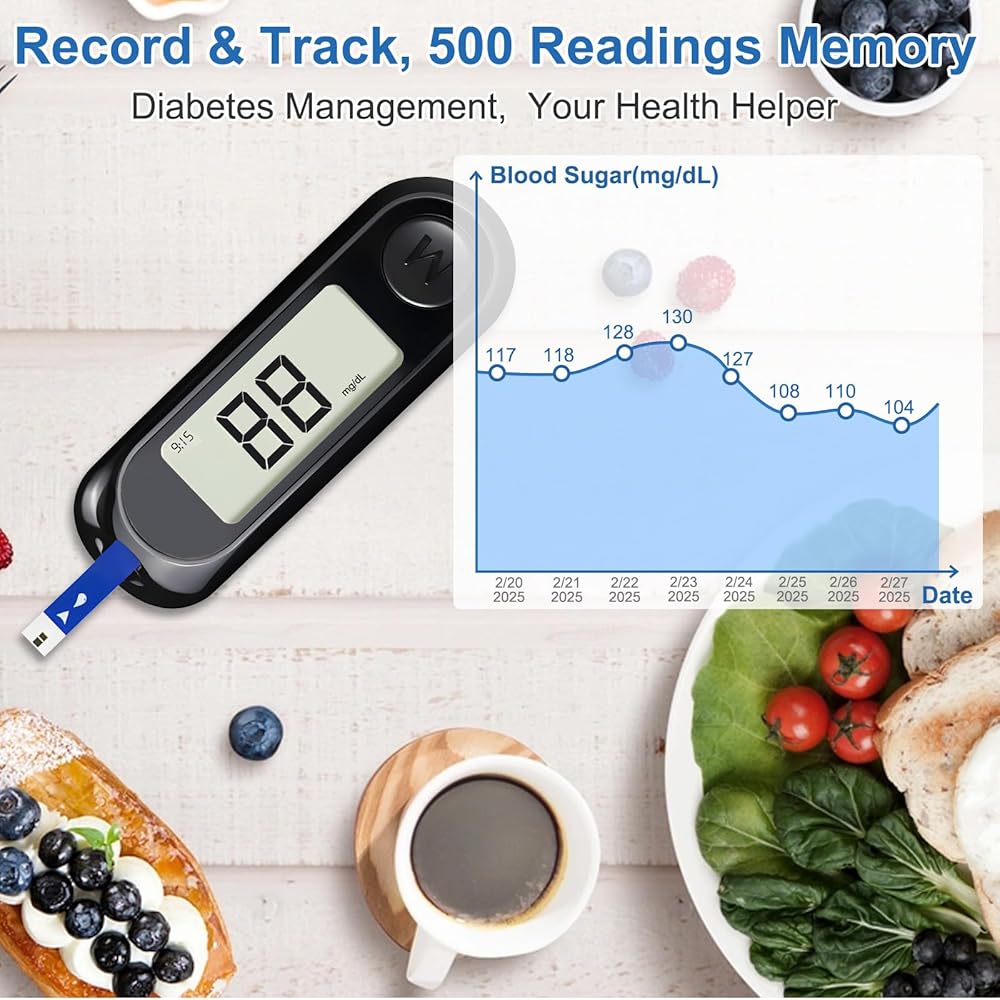 📊 [ذاكرة 500 اختبار + شاشة LCD صديقة لكبار السن] يمكن لمجموعة اختبار مرض السكري تتبع الاتجاهات من خلال تخزين 500 نتيجة وتحليل الأنماط عبر شاشة بإضاءة خلفية مقاس 2.4 بوصة مع خطوط مكبرة بنسبة 200٪. لا حاجة إلى نظارات قراءة للمستخدمين كبار السن.