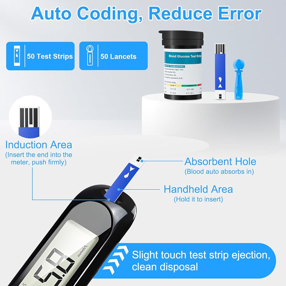 جهاز مراقبة نسبة السكر في الدم، طقم مراقبة الجلوكوز مع 50 شريط اختبار و50 مشرط لاختبار مرض السكري، جهاز قياس نسبة الجلوكوز في الدم مع إخراج تلقائي، بدون ترميز وشاشة LCD كبيرة لكبار السن
