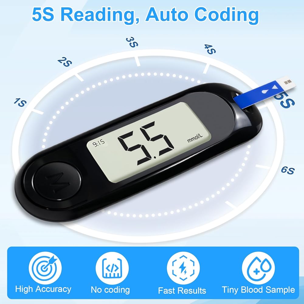 ⚡️ [نتائج مدتها 5 ثوانٍ ولا يلزم وجود ترميز] تحصل مجموعة مراقبة نسبة الجلوكوز في الدم على قراءات دقيقة سريريًا في 5 ثوانٍ فقط مع التنشيط التلقائي للشريط - لا حاجة إلى ترميز يدوي. أدخل الشريط واختبره على الفور، وهو مثالي لكبار السن وأنماط الحياة المزدحمة.
