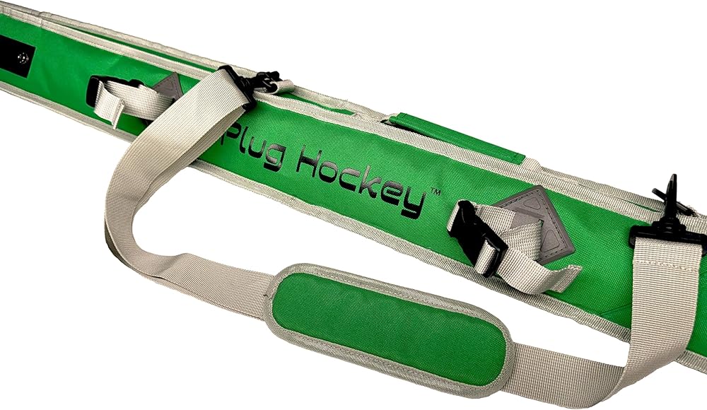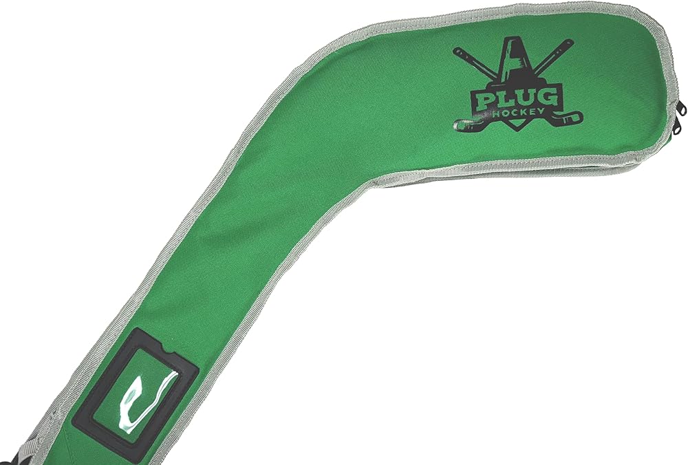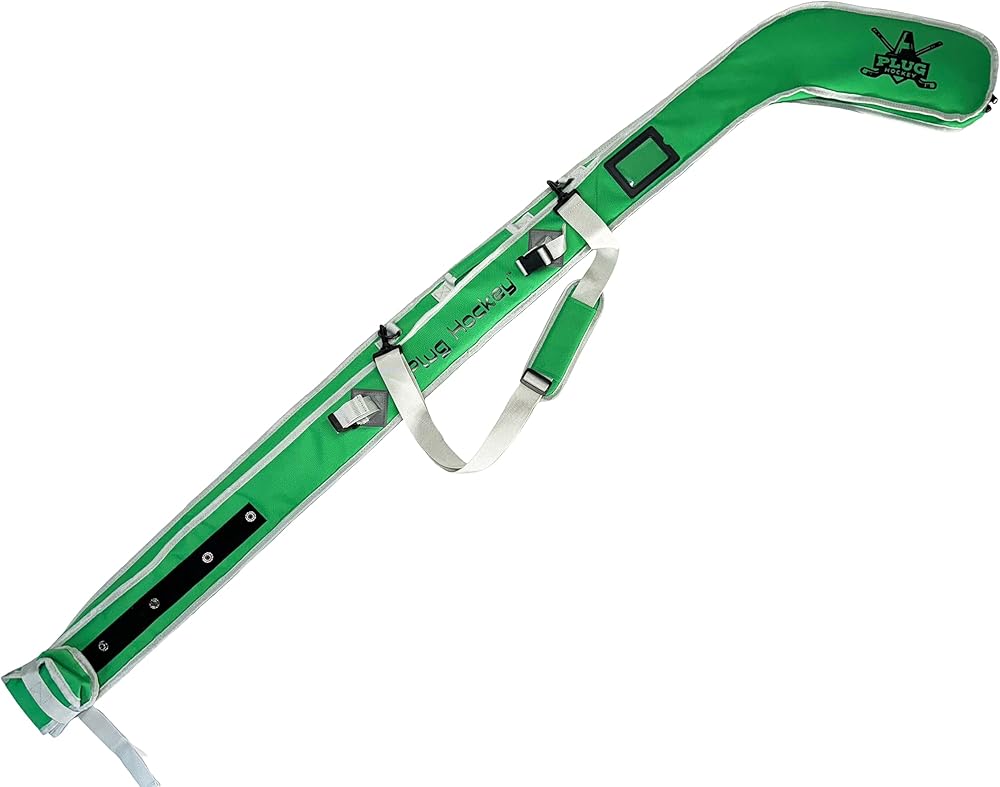 Plug Hockey stick bag is the most advanced in the industry, with more features and protection. That out way the competition by far. We start with a simple task first of using colors to identify your hockey stick bag easier at the airport. Instead of looking at everyone with the same black bag. With this we have quick access identification pocket as well. Offering up the best protection with fully padded bag, and thickest material in the industry used on suitcases (900D nylon). This bag can be walked on in the locker room with skate blades and will not be cut through for long lasting. The stylish piping added, isn't just for looks. Adds durability to the seams. One of the most unique features of this bag, and is not found on any other bag on the market. Is the hockey bag clip system carrying system. This clip system makes the hockey stick bag hands free. Which we all know traveling through the airport can be a huge benefit. Leaving your hands free to carry your roller bag or anything else you need. Having full padding throughout the bag and having an adjustment strap on the end to tighten the sticks together. Buttoning the proper height level will lock them in place. They will not shake around, rub, or make noise while in the car. Just a quick cinch of the strap and snap the buckle in. Keep those expressive hockey sticks in perfect condition for the tournament at hand. Don't get stuck with a sub par product and support the newest brand making a difference.