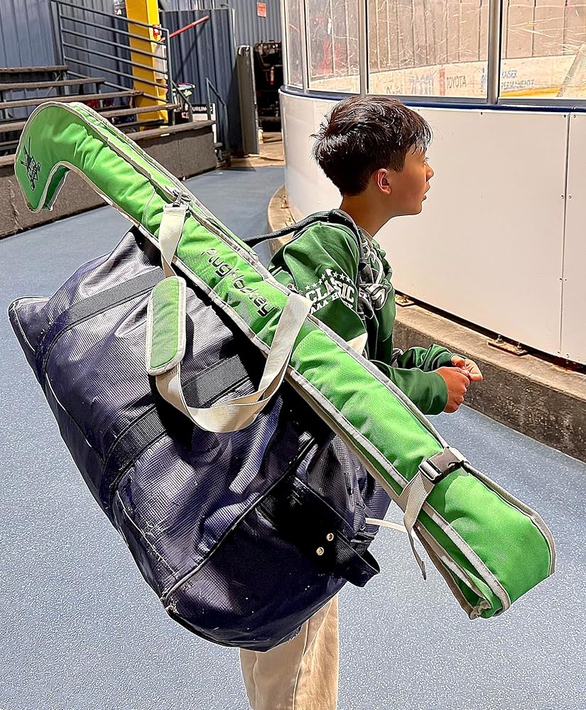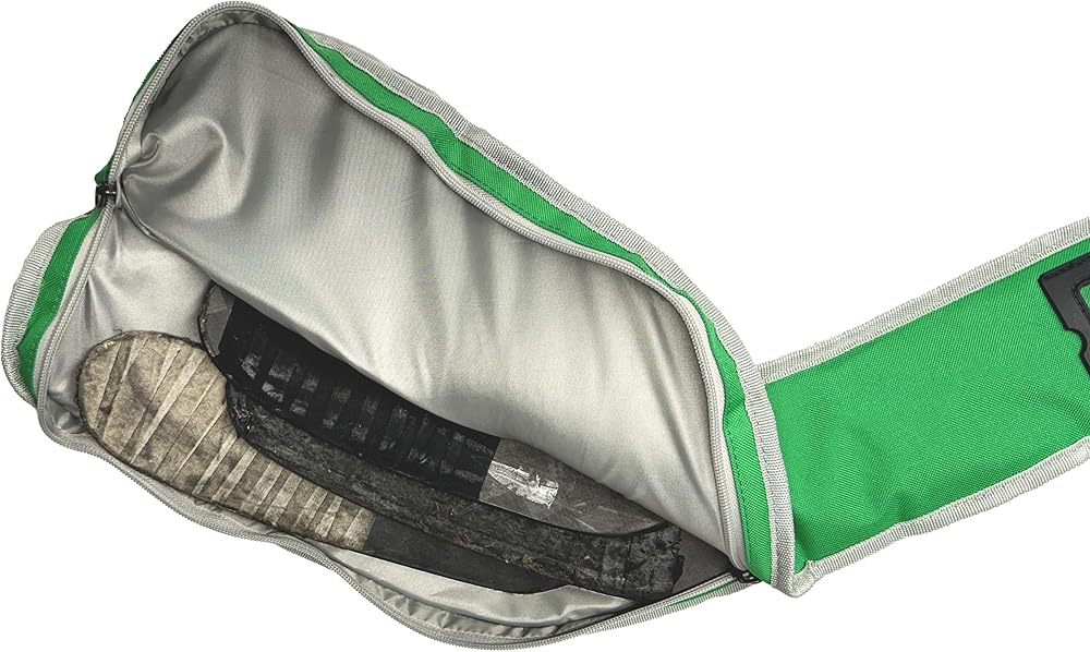 (PROTECTION) Only stick bag on the market to feature 900D waterproof nylon, padded entirely throughout, with heavy duty double zipper design. Reinforced piping for strength. Will resist skate blades from cutting thorugh, when being stepped on in the locker room.